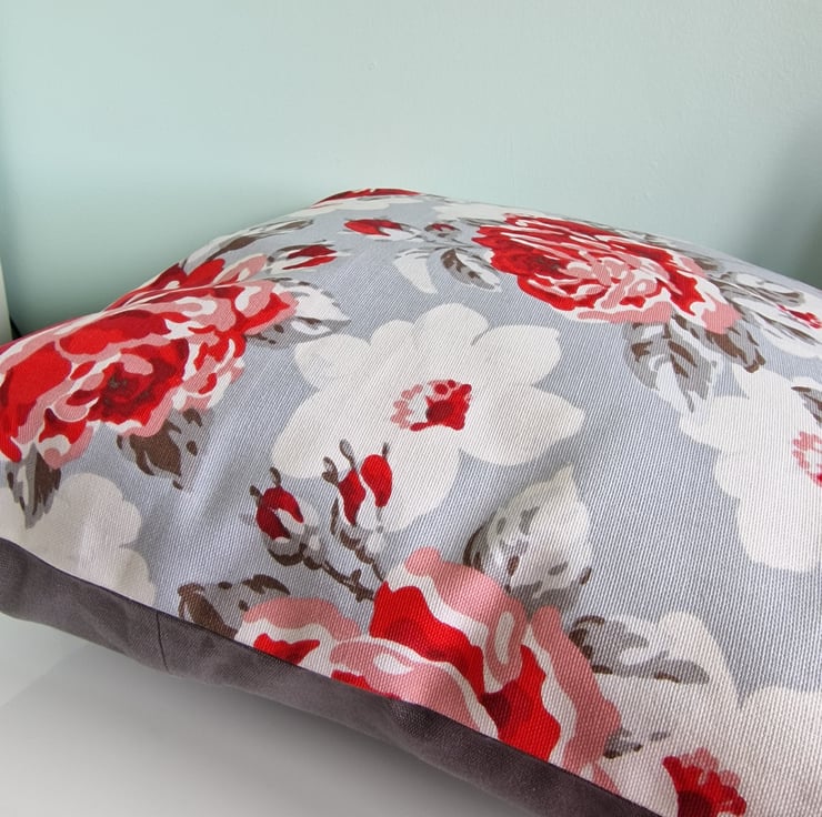 These colourful cushion covers are made from 100% cotton and are soft & smooth material. The front panel of the cushion cover is a Cath Kidston "Rose Bloom" print in shades of pink & red, on a grey/blue background. Pattern placement may vary from that shown.