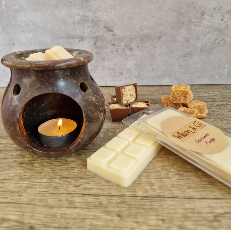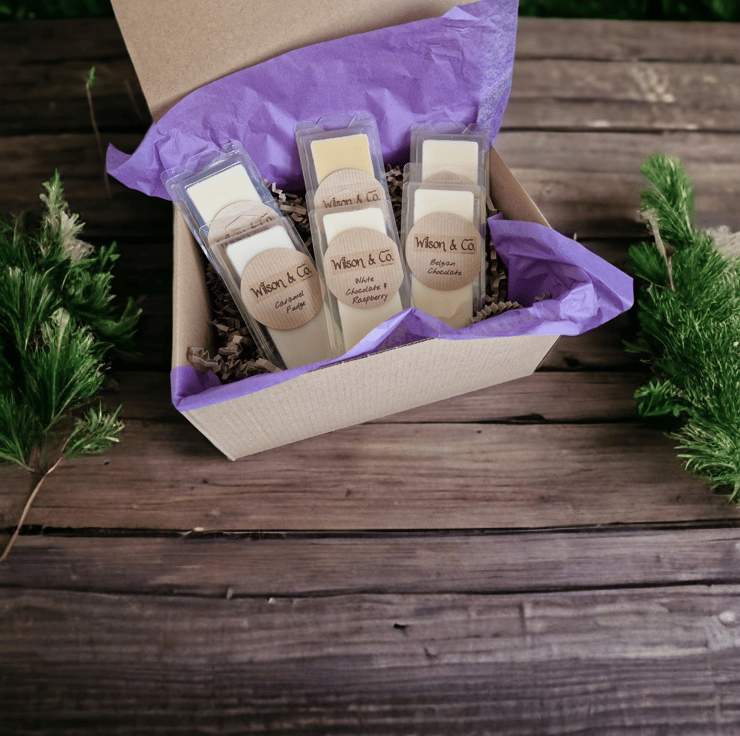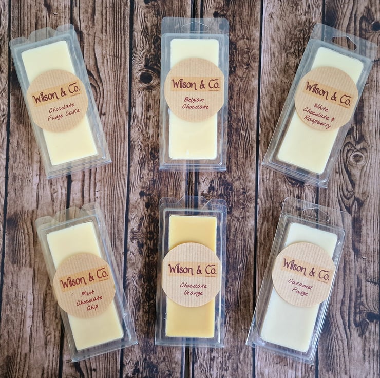 Our wax melts come in 50g snap bars with packaging that is recyclable. Each wax melt is made from 100% soy wax and is vegan friendly.