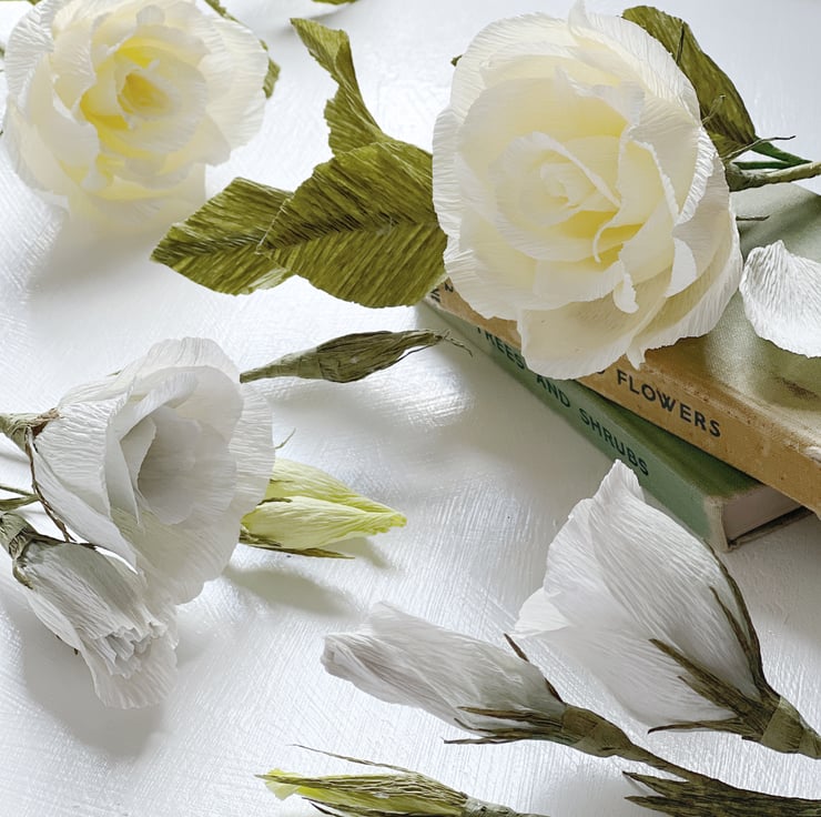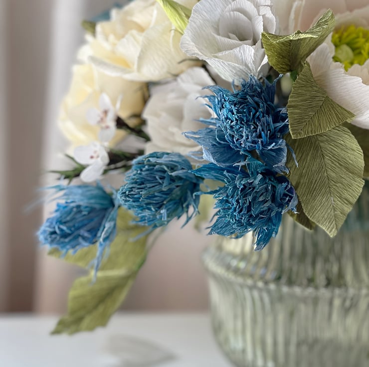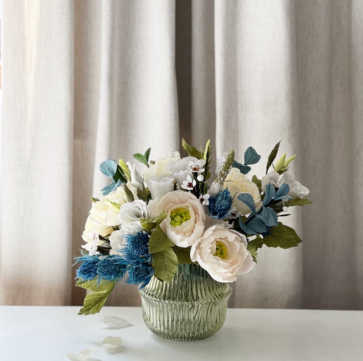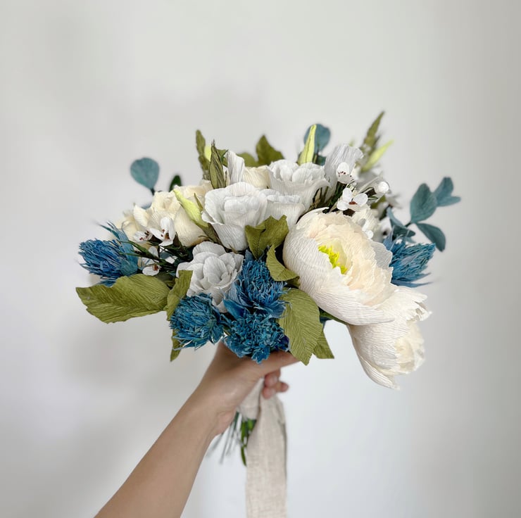 The flowers and leaves are made from premium Italian crepe paper which has brilliant colours and a texture that mimics nature. I hand cut the petals and leaves from this paper then shape them one by one to create unique dimensions. I put them together into flowers and leaf stems into metal wires and some in plastic tubes covered in floral tape. After creating the individual blooms and foliage, I arrange them to form this bouquet and finally tied with a satin ribbon.