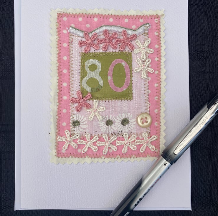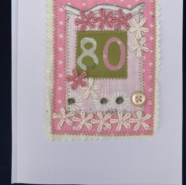 Pink and green theme, with a fabric 80 in the centre and white and pink lazy daisies around. Topped with a button and all stitched to a piece of vintage fabric