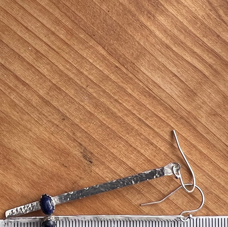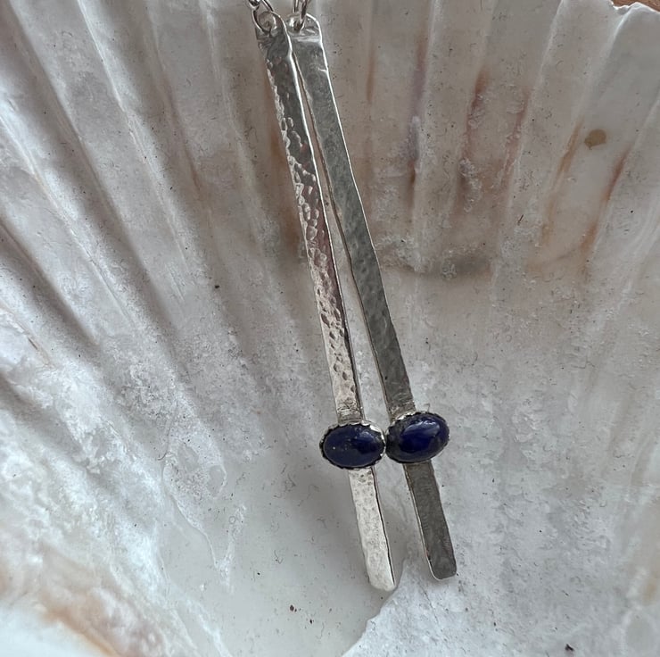 Long elegant bars with a beautiful deep blue lapis adorning the hammered surface.