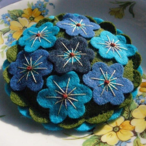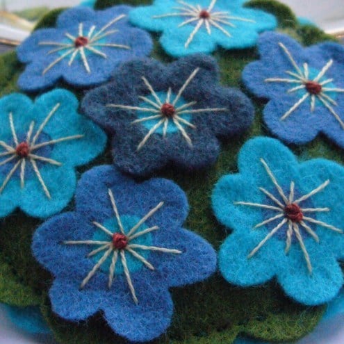A cluster of felt forgetmenot flowers in various shades of blue decorate this brooch. It is completely and carefully handstitched - the stitches holding the flowers in place are visible and form the flowers stamens- each flower is finished with a french knot in the centre.