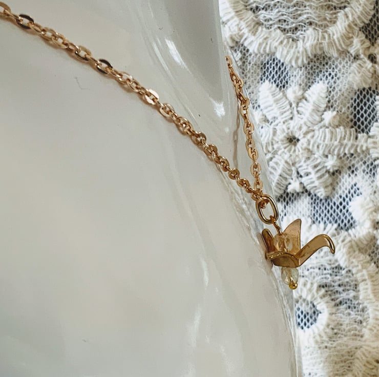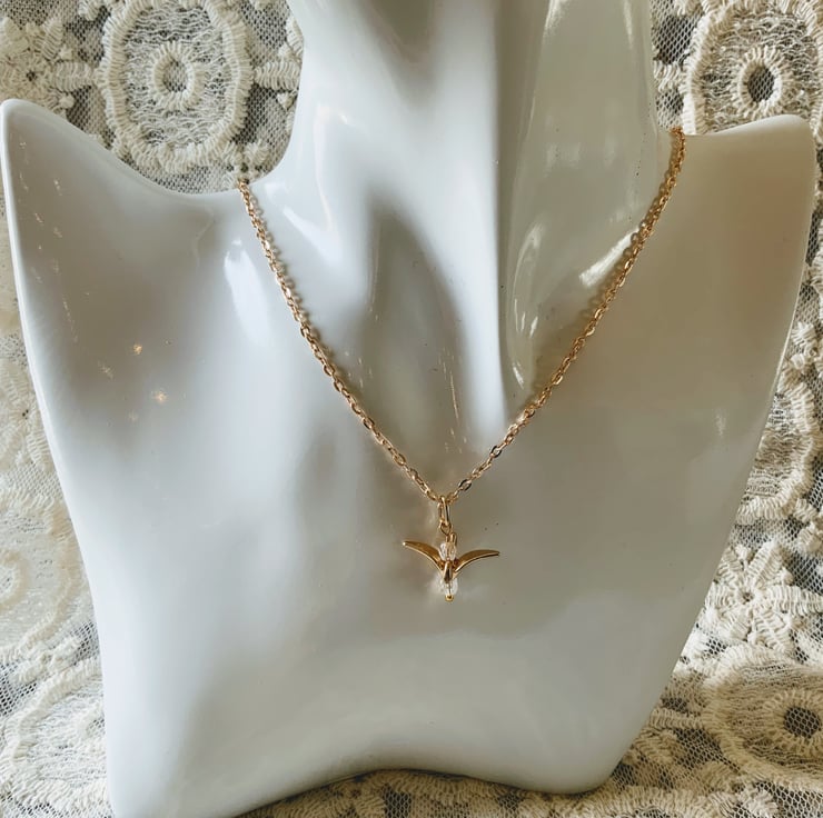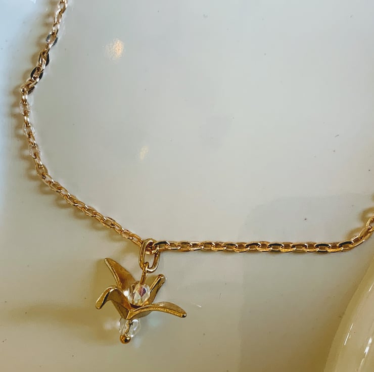 Featuring two mini white swarovski crystals that hang top and bottom of the crane bird reflecting beautifully in the light.