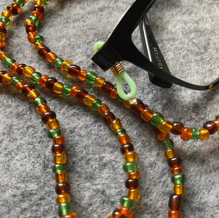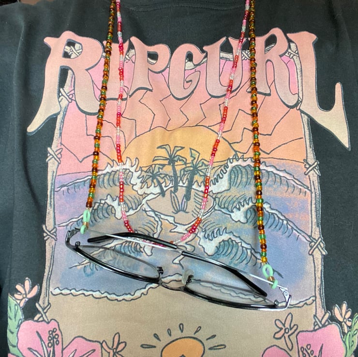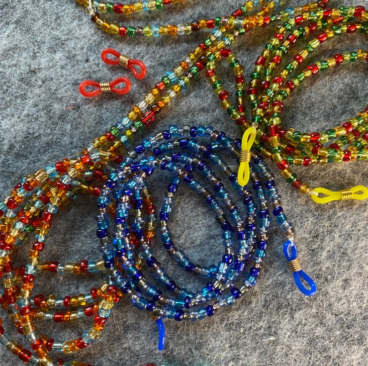 A handy funky accessory to keep your glasses around your neck. Handmade using glass beads and rubber loops, all metal is gold plated. Like a necklace but with your glasses attached! Great for both prescription glasses and sunglasses. Limited colours left, they will be first come first serve. The blue has gone. Custom colours on these are available, please message me.