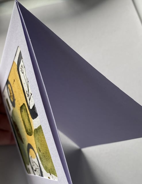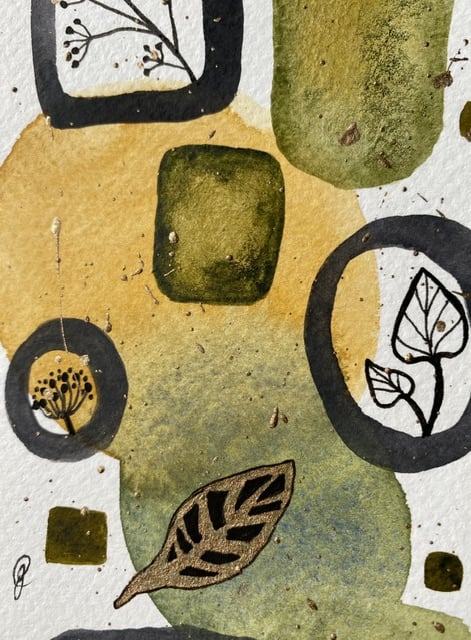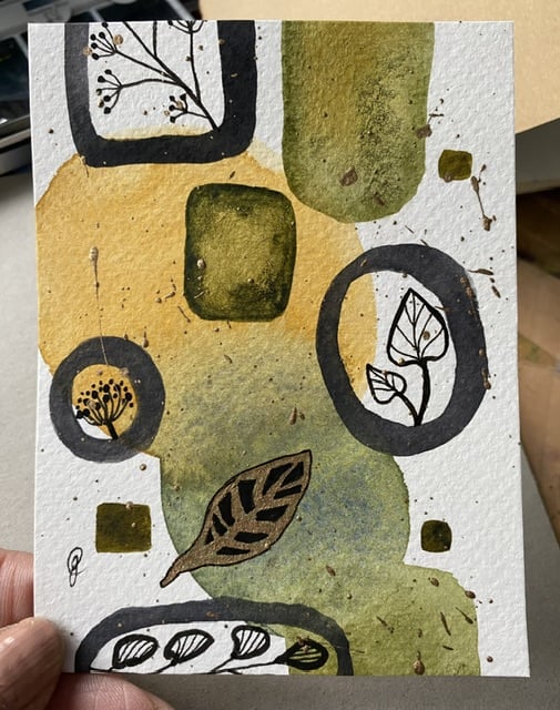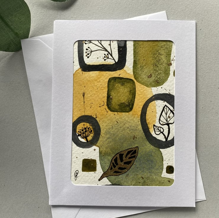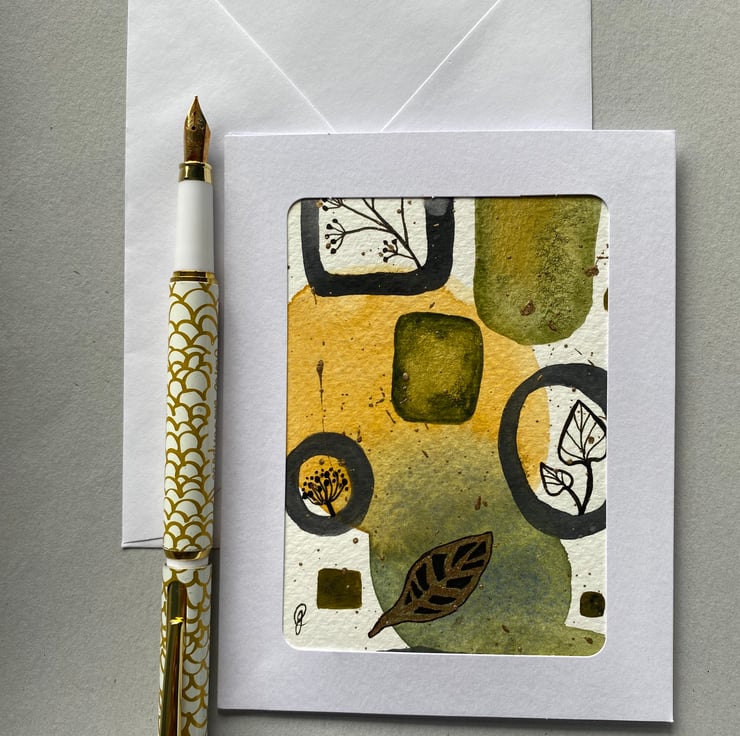 This is a hand painted mini artwork inserted into quality card stock. Painted in watercolour and ink on watercolour paper using Artist quality materials, then embellished with gold ink. It measures approx 13.5 x 11 cms, and comes with matching envelope within a cello bag. It will be sent postage free to UK destinations.