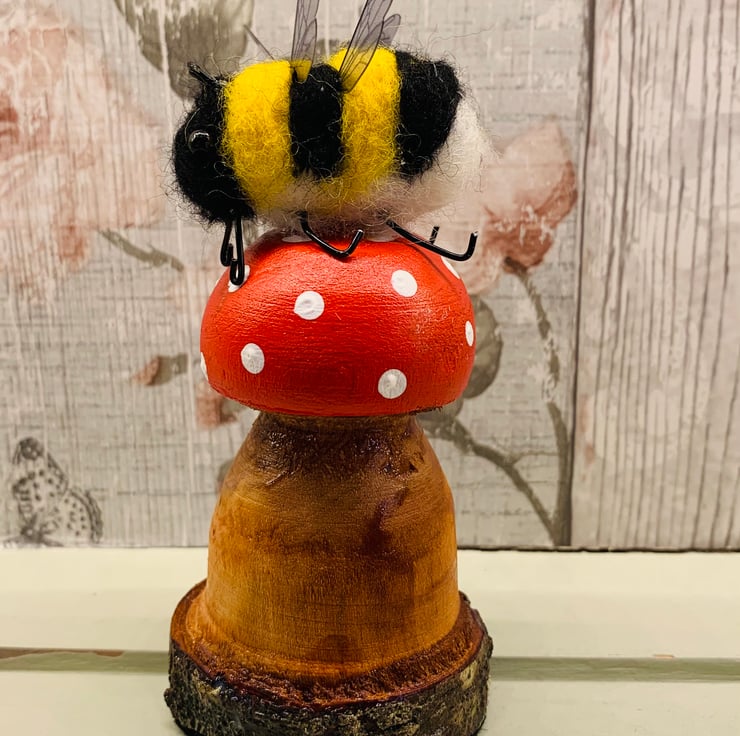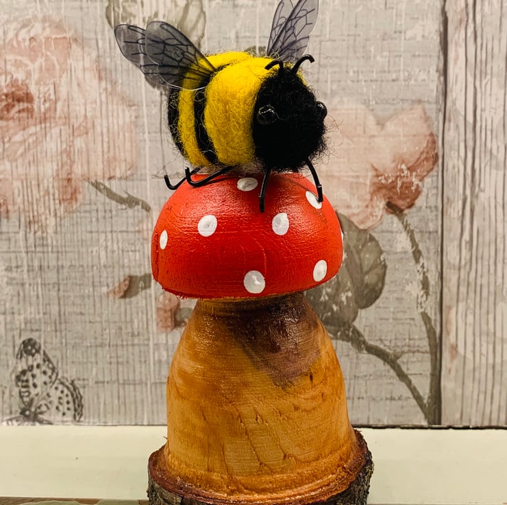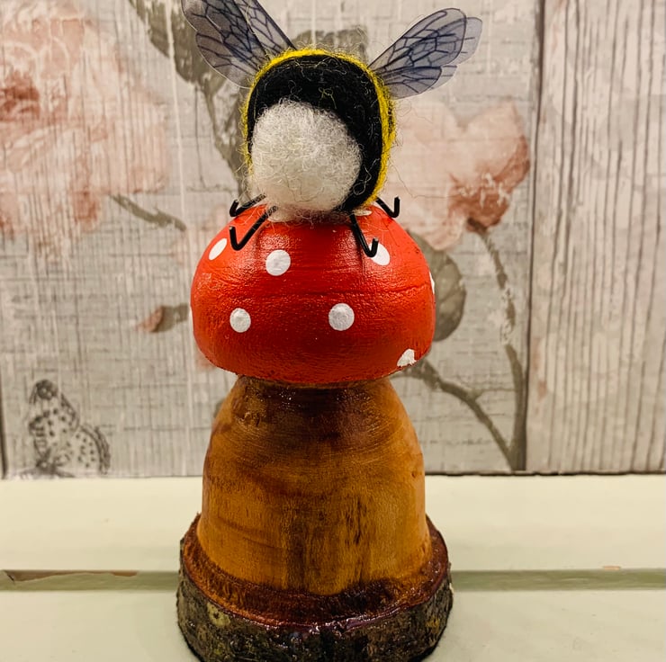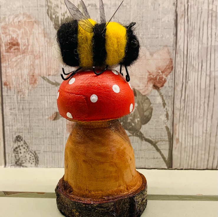 A cute little needlefelted bumble atop a hand carved and decorated wooden toadstool