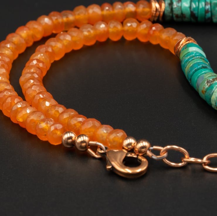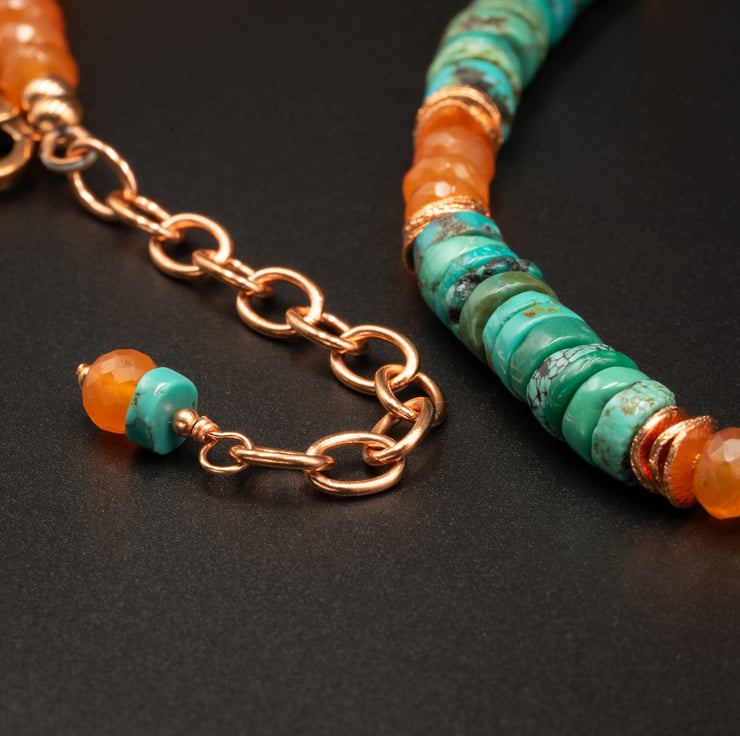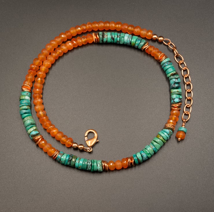 Finished length is adjustable from 18 - 20 inches / 46 - 51cms and the necklace fastens with a copper plated lobster clasp . The pure copper extender chain is finished with a matching carnelian and turquoise charm drop.
