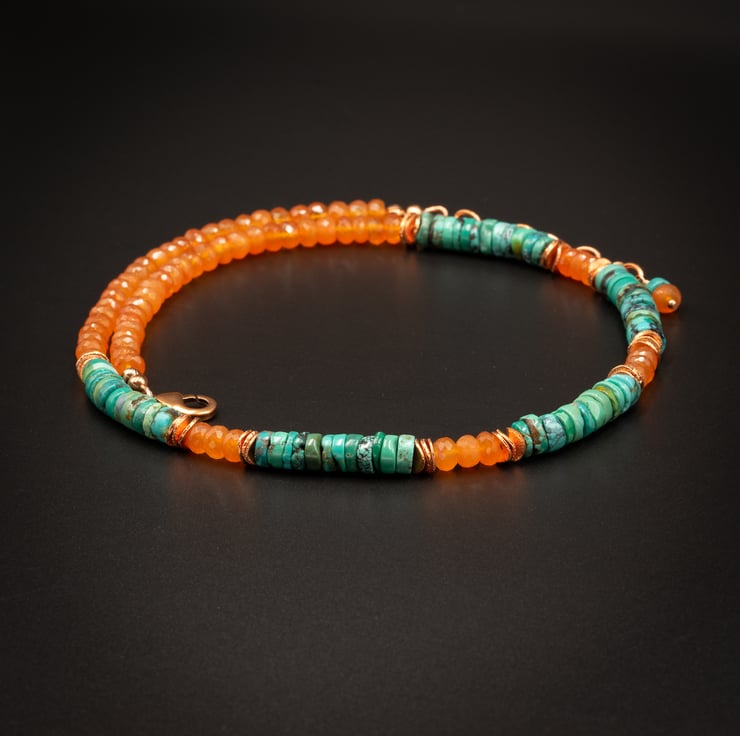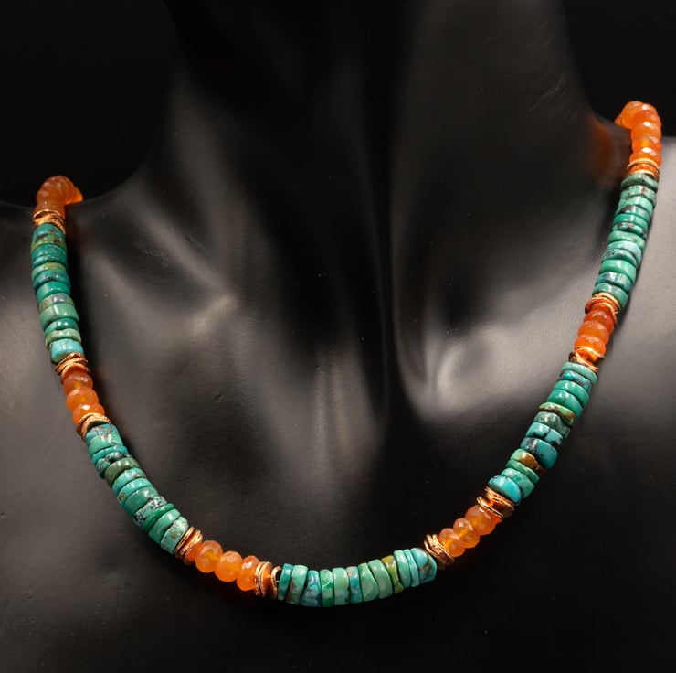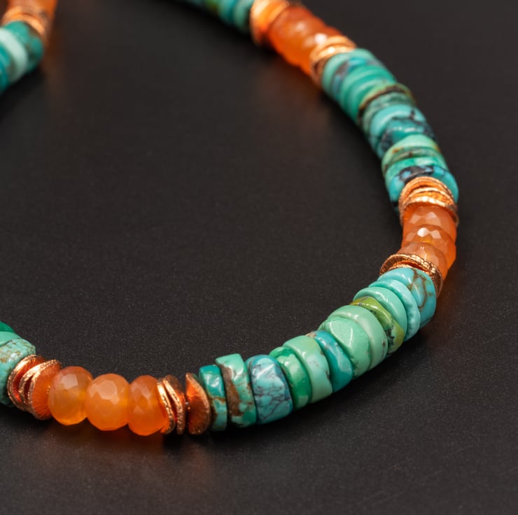 This bold statement necklace is made with natural turquoise 7mm heishi beads and 5mm faceted carnelian rondelles separated by copper discs.