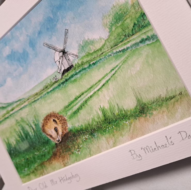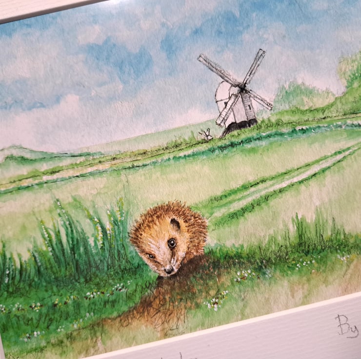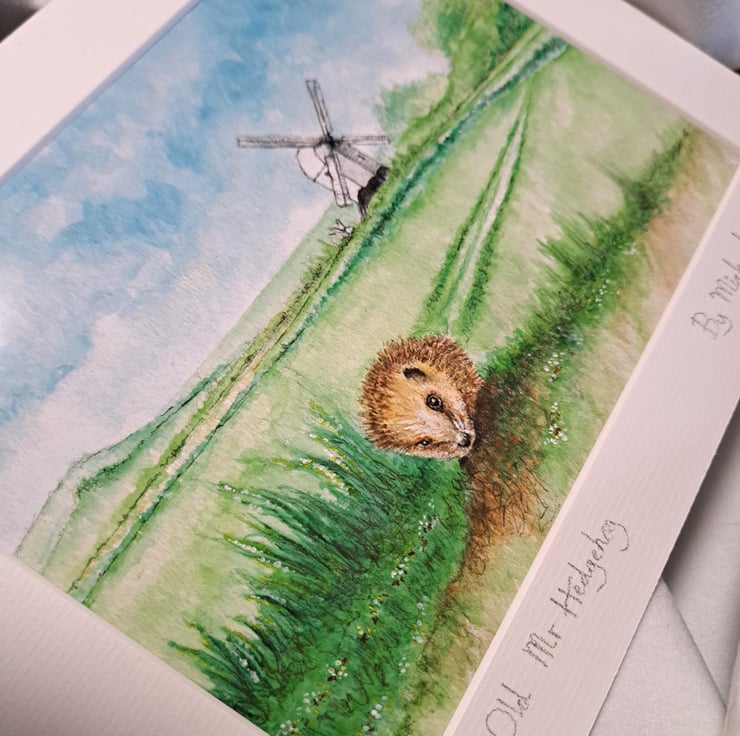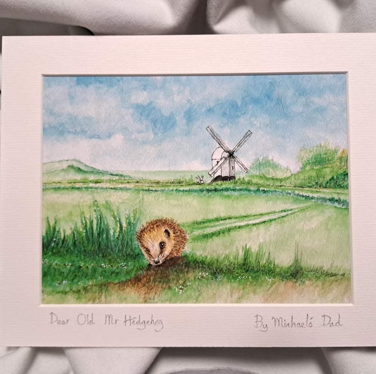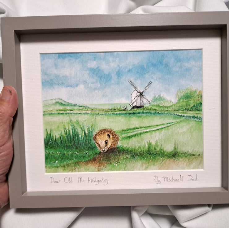 An Original Iillustrated Watercolour print of a Hedgehog on the Sussex Downs southdowns. Presented and signed in a mounted Grey wooden frame with a grain finish 10" x 8" (print: 8" x 6") 22mm wide and 22mm deep. Based on the original story from the illustrated book 'I am Michael Glare and this is my Life' (Chapter 46: A Smile for dear old Mr Hedgehog), with over 400 watercolour illustrations like this. Every picture tells a story.