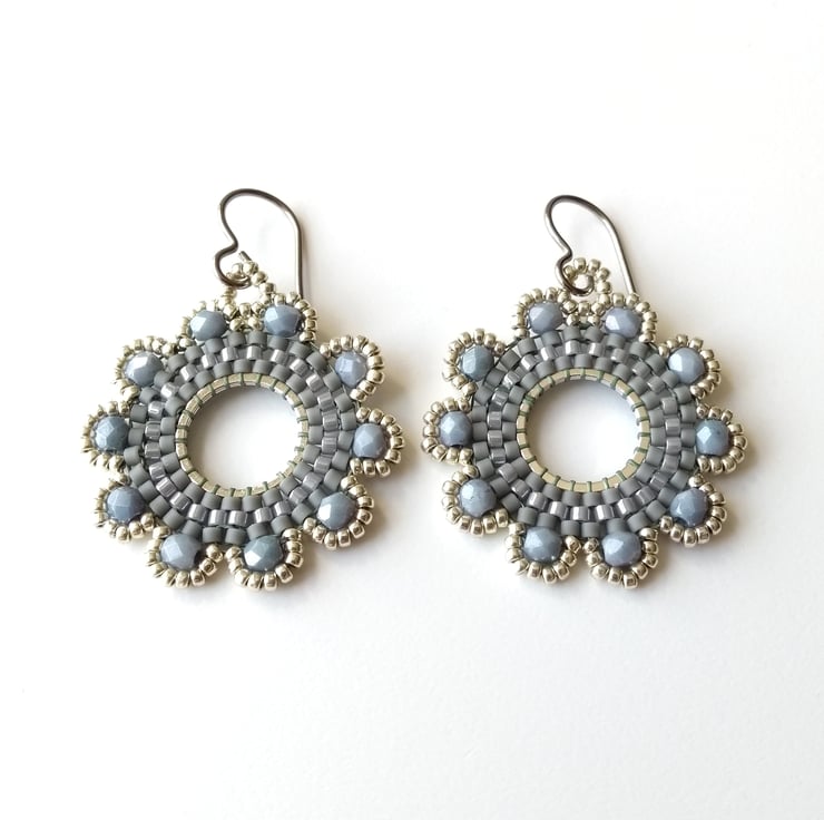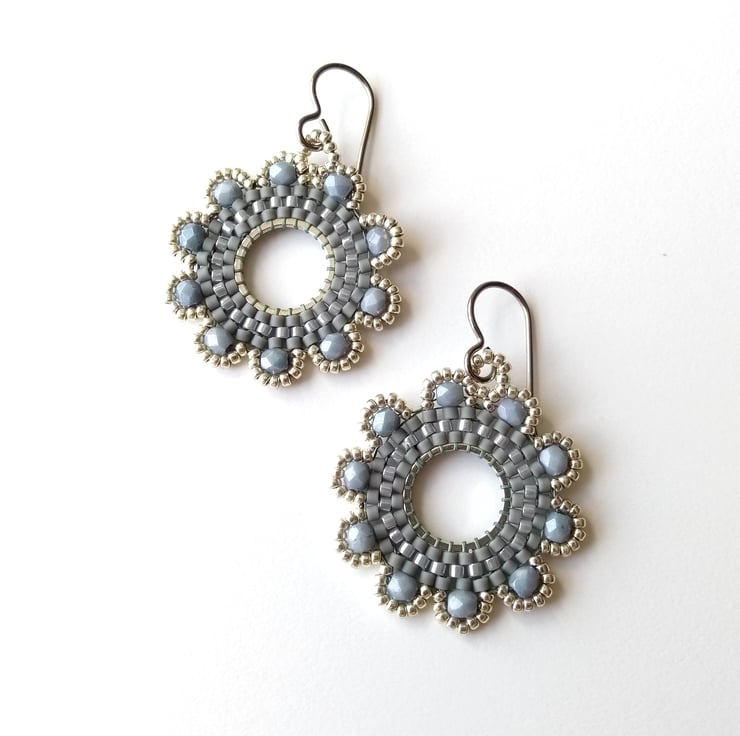 Designed by yours truly, I have used brick stitch to secure cylinder beads to a silver-coloured metal ring and then embellished it with Czech fire-polished beads and added a decorative scallop border. This colourway uses pretty soft matte greys and silvery blues. Some of the beads have a pearly sheen to them and catch the light nicely - I hope you like them as much as I do!
