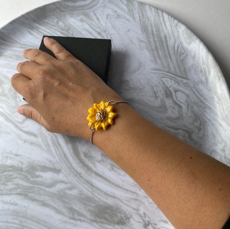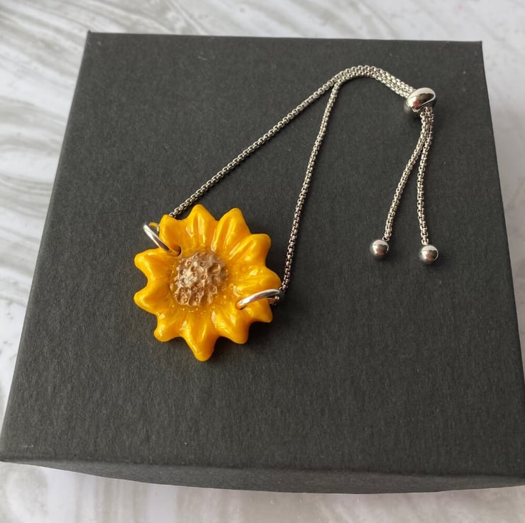 Hand painted polymer clay Sunflower adjustable bracelet. Handmade with polymer clay, mica powders and resin on a stainless steel adjustable chain. An ideal gift for sunflower lovers. The easy adjustability of the bracelet makes this an ideal gift. No more fiddly clasps to battle with or waiting until someone else can help!