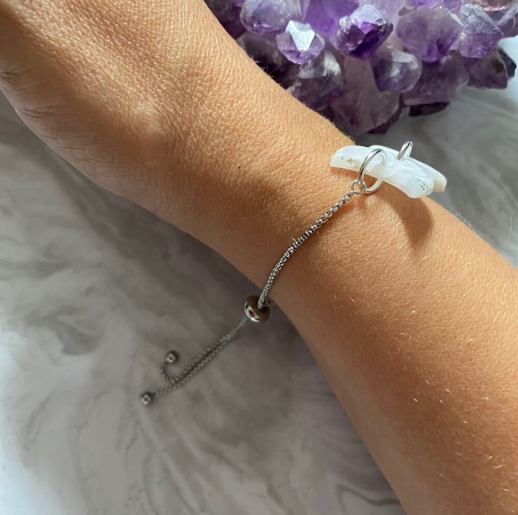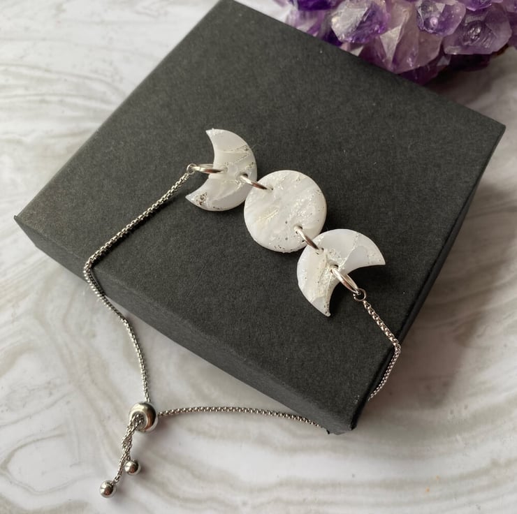 Triple moon adjustable bracelet in white and silver with a stainless steel chain. Handmade with white and translucent polymer clays and silver metallic leaf. I cut and shape the moon phase pieces by hand and once baked add a clear layer of resin over the top to seal and protect and add a smooth glossy finish. This is a fabulous bracelet, no more fiddly clasps or waiting for someone else to help.