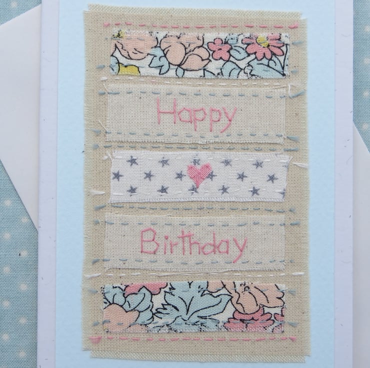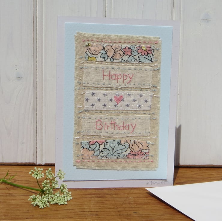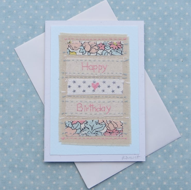 For this hand-stitched card I have embroidered the words 'Happy Birthday' adding pretty fabrics and a tiny applique heart. I have left the raw edges and thread ends showing to give the miniature textile a 'homespun/homemade' feel.
