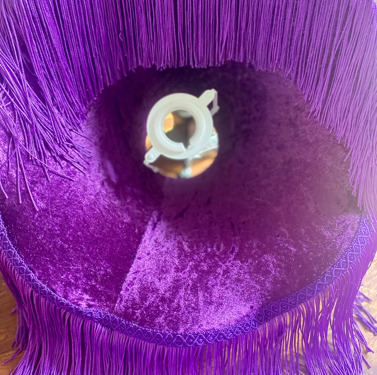 This lampshade is trimmed with Cadbury-purple silky braid, and has two layers of matching purple fringing.