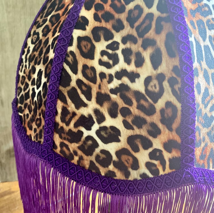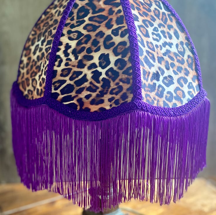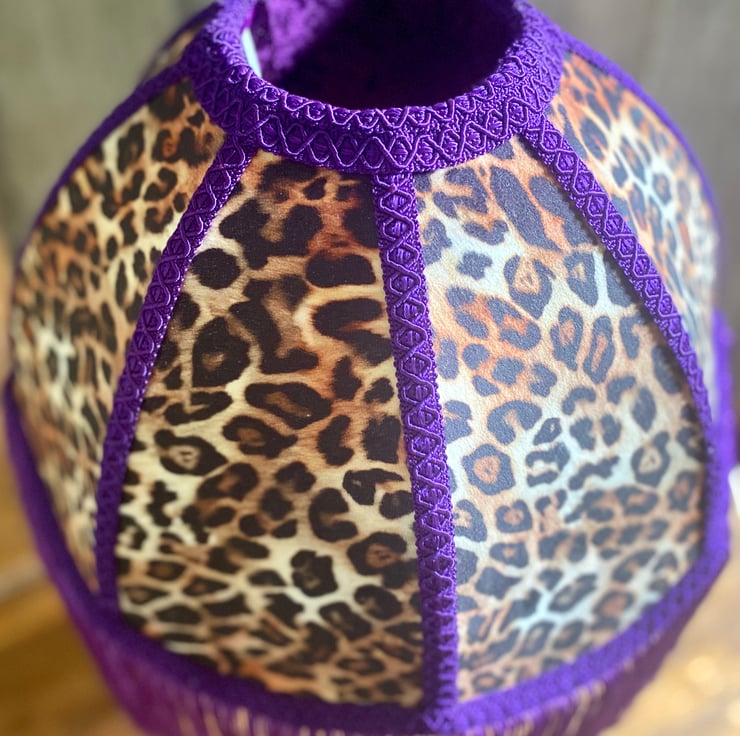 A 12” traditionally hand bound and hand sewn lampshade in a funky animal print velvet.
