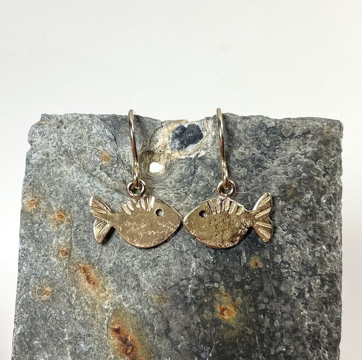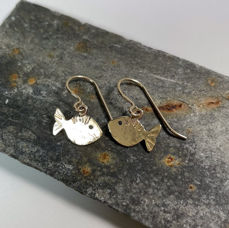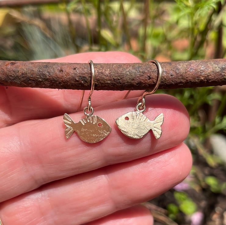 I have cut these fish shapes from recycled 9ct yellow gold sheet. They have been textured and stamped with extra fishy detail.
