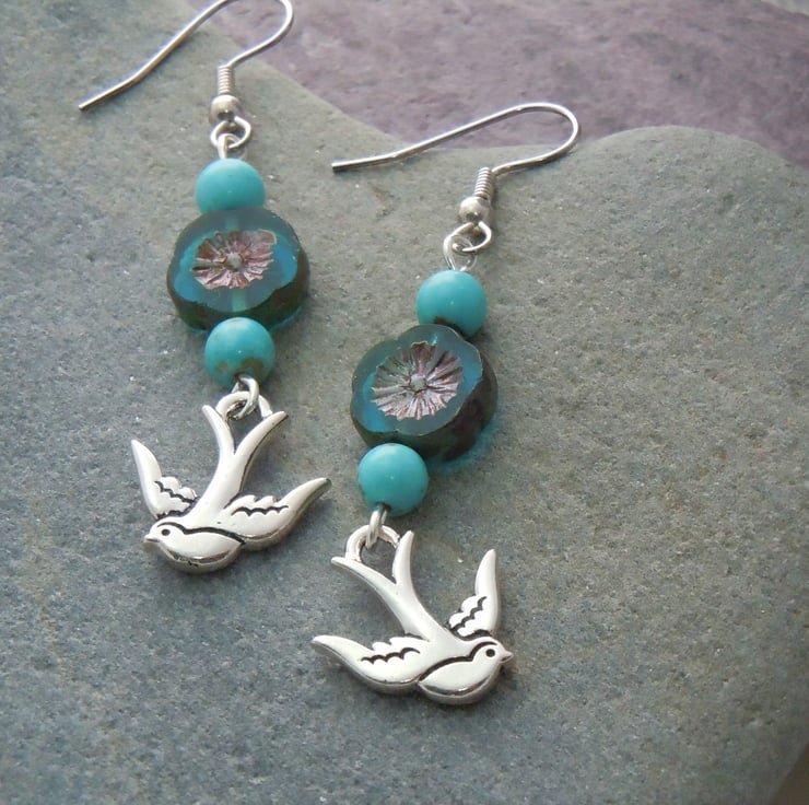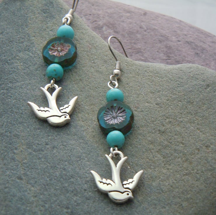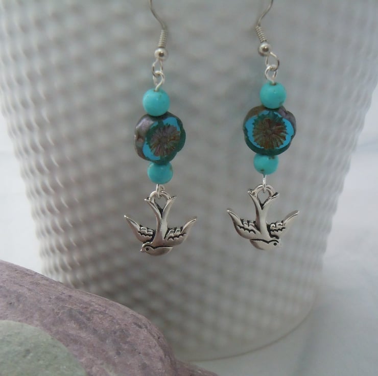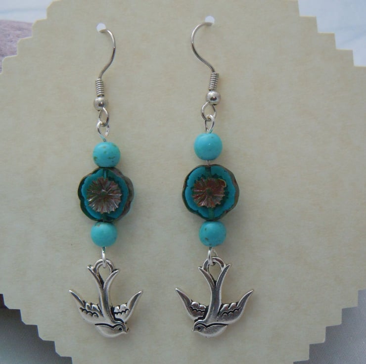 Lovely dangle earrings with Czech glass translucent turquoise & silver flower beads with turquoise Magnesite round beads & a silver plate Tierracast double sided swallow charm. The wires & ear wires are sterling silver.