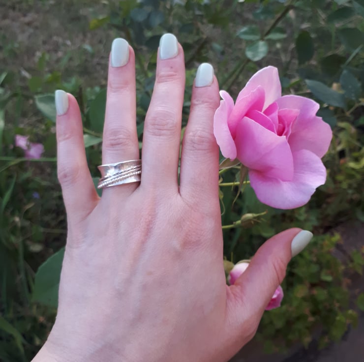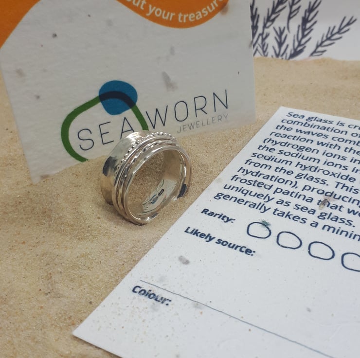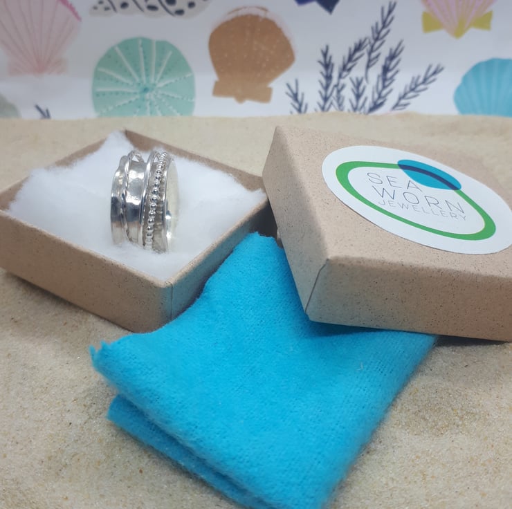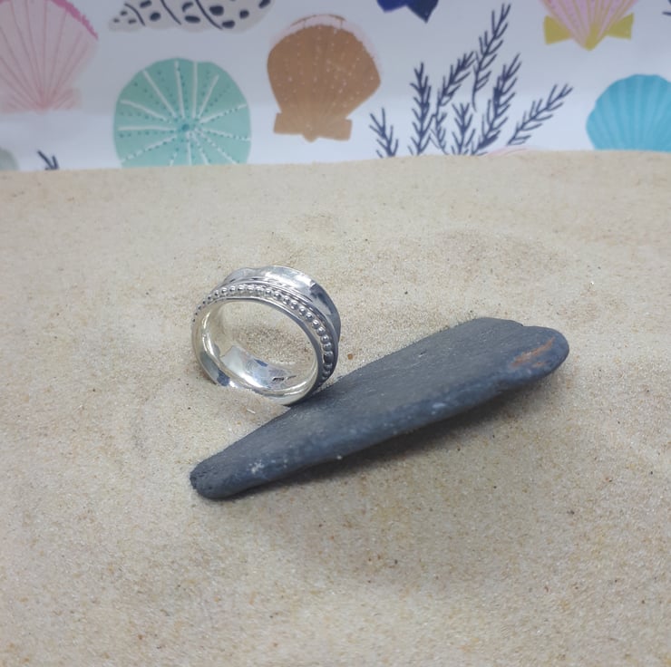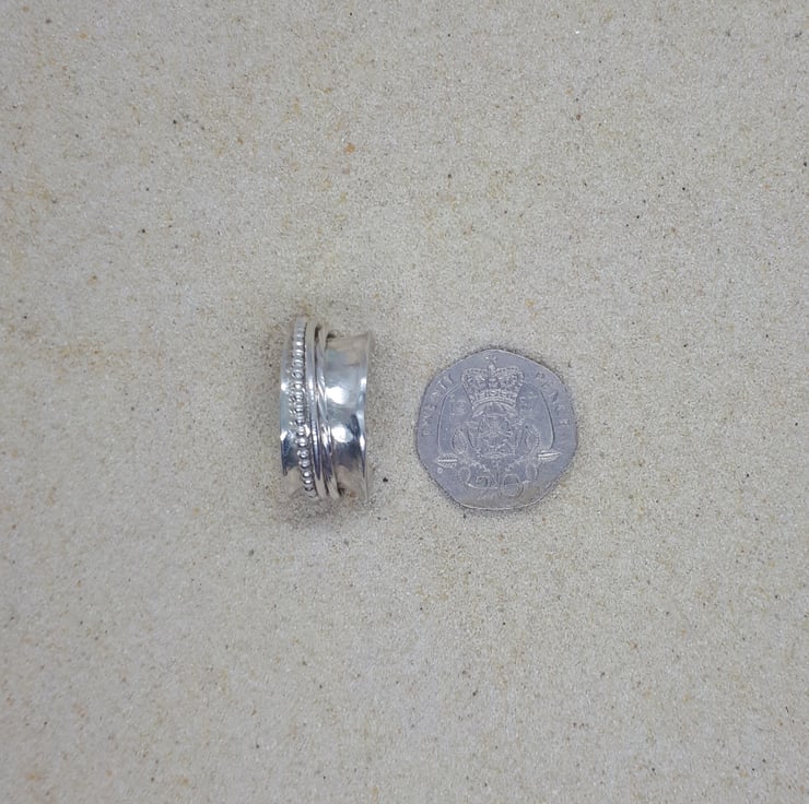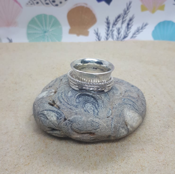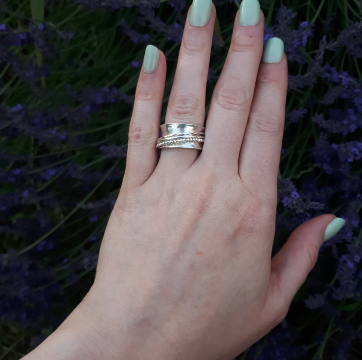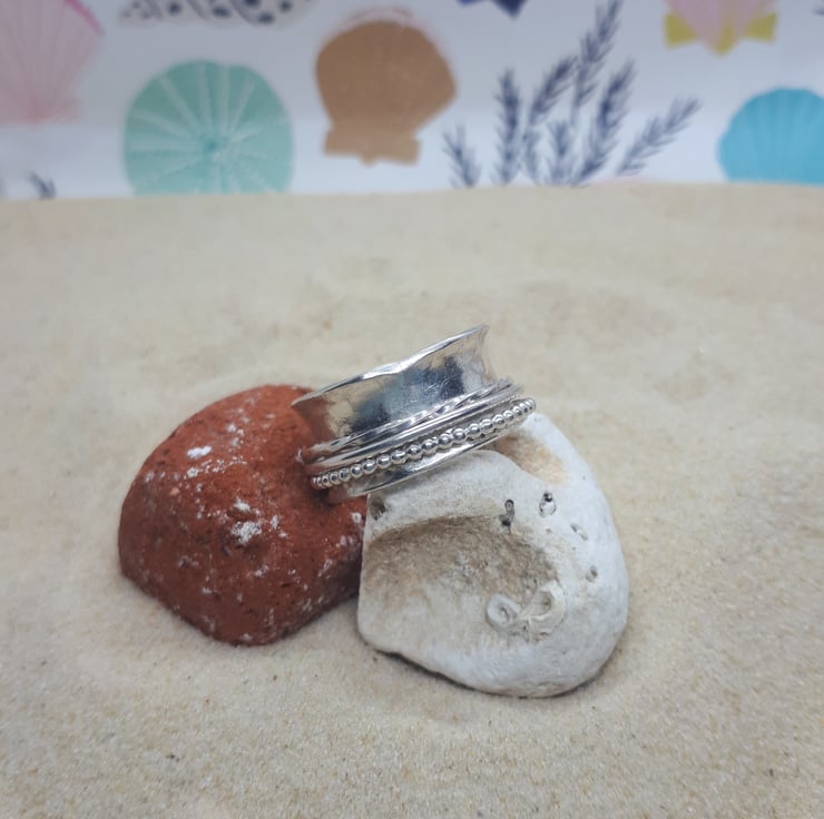 A 1.1mm thick sterling silver hammered band, approximately 1.1cm wide with 3 different spinning rings - 1 plain silver, 1 silver bobble band, 1 twisted silver band.