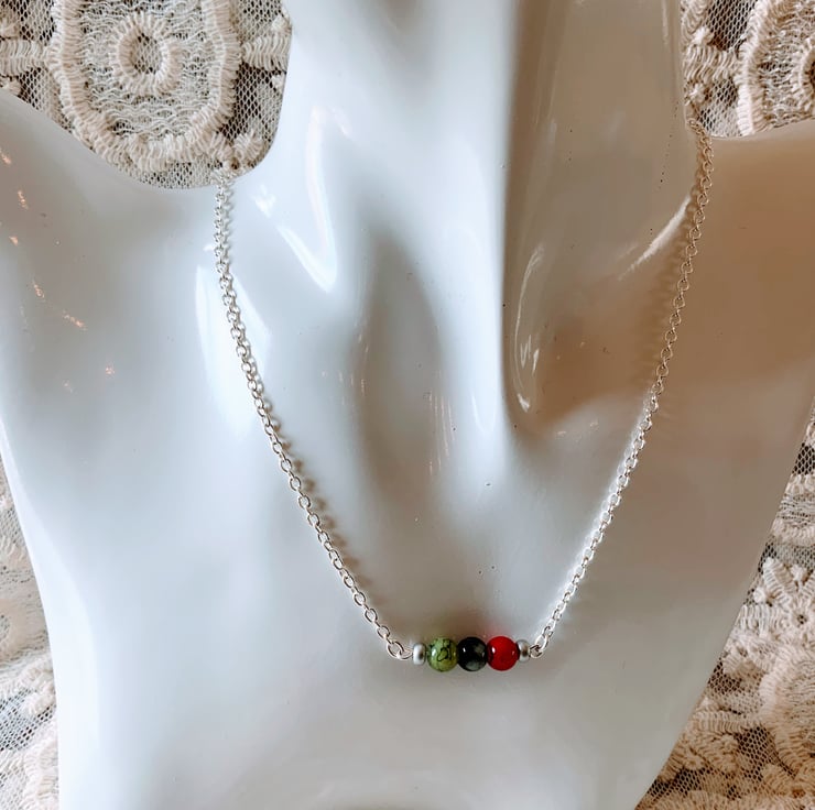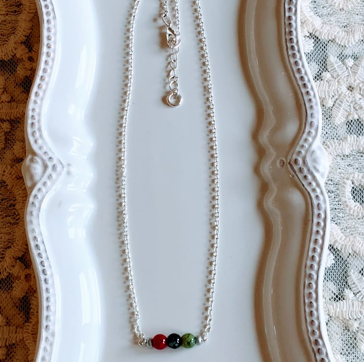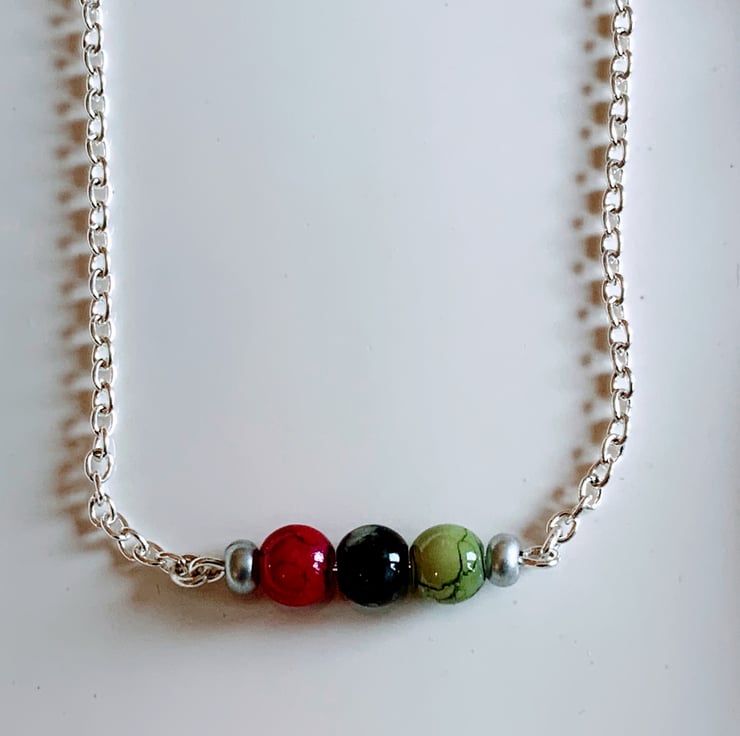 Green black and red marble glass beads that reflect beautifully in the light on a silver plated cable chain.