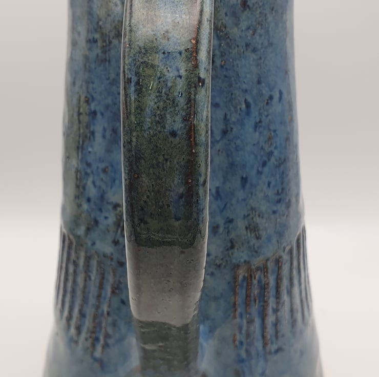 Tall stoneware jug. Wheel thrown. Glazed in blue green over a textured and carved surface.