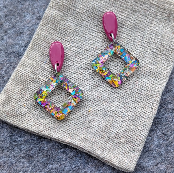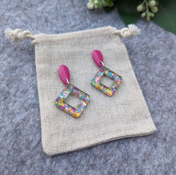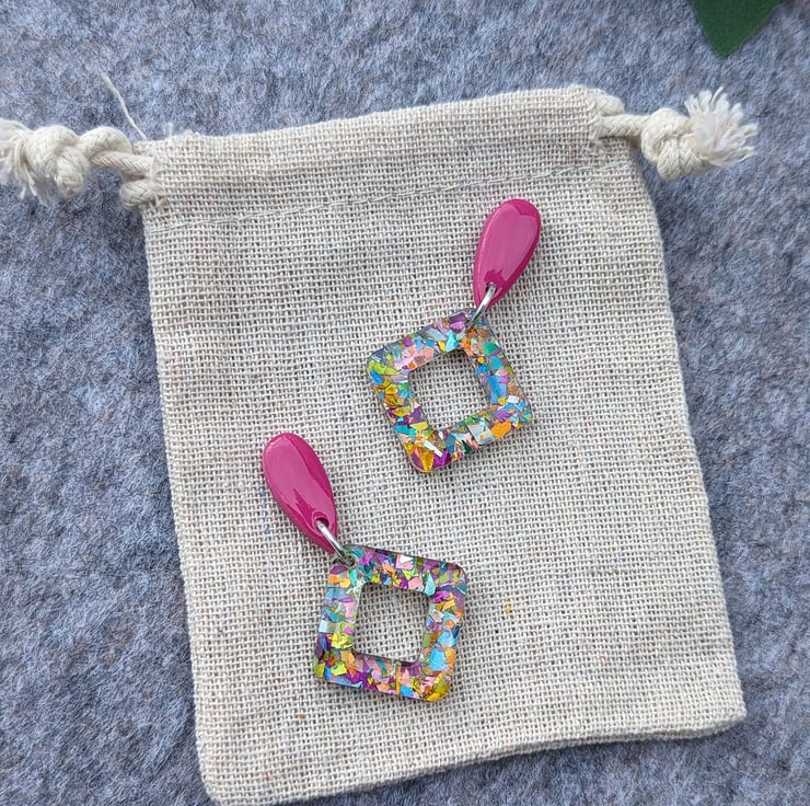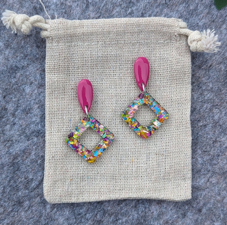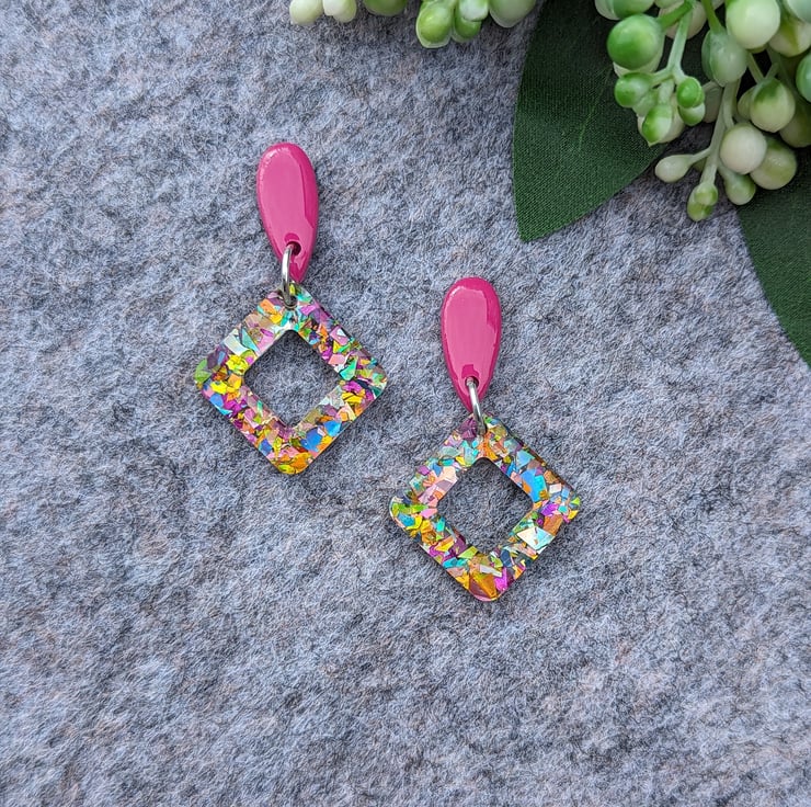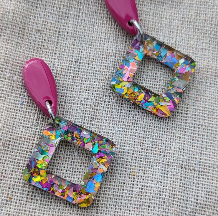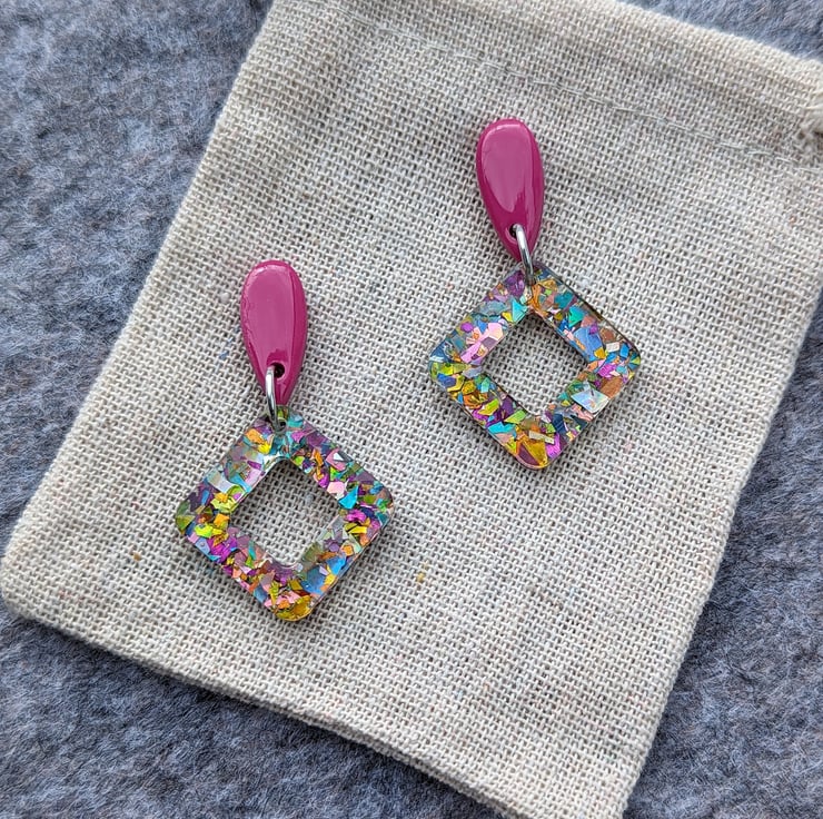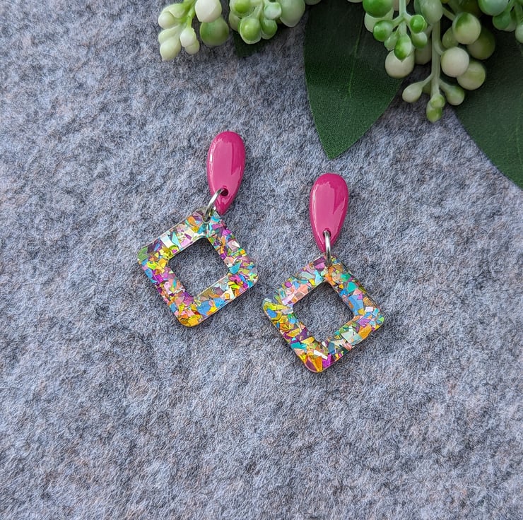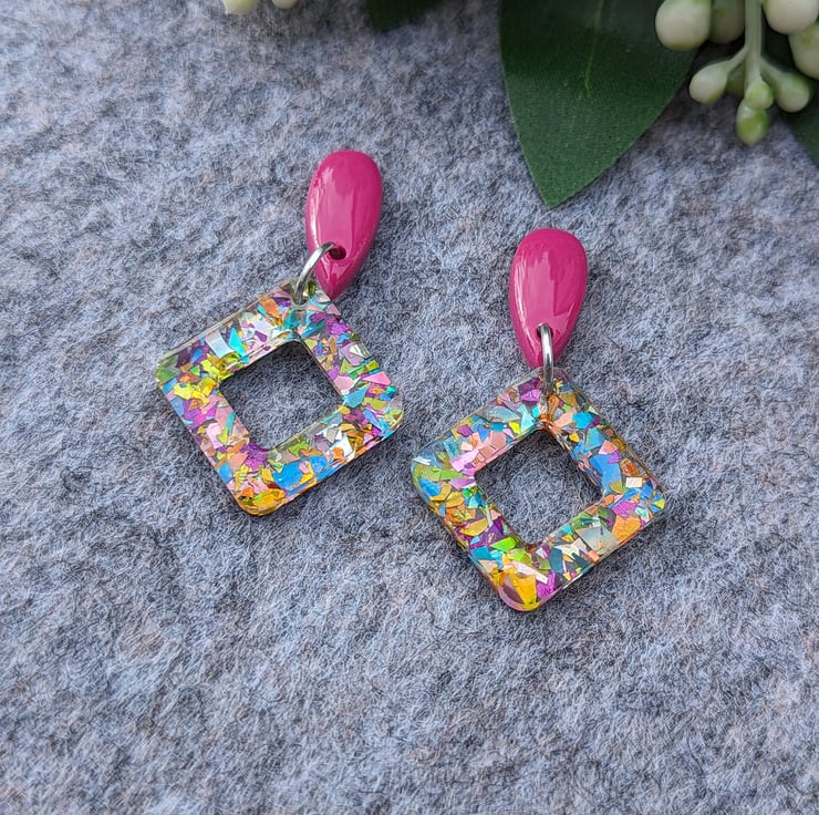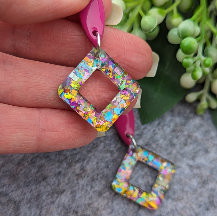 Attached to a square doughnut of carnival mixed multicoloured glitter acrylic with an added cost of UV Resin
