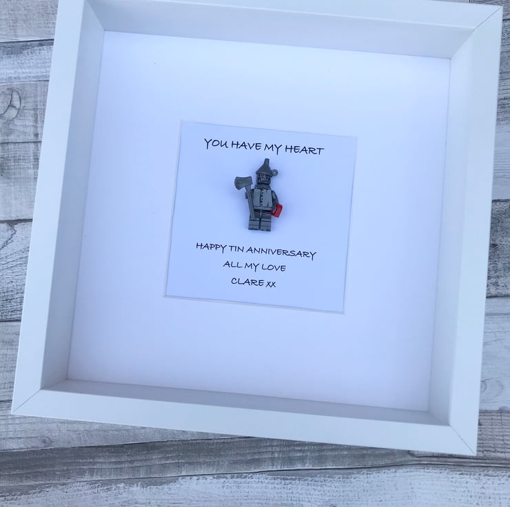 Made from mini figure of the Tin Man from the Wizard of Oz on a personalised backing, and set within a deep box frame.