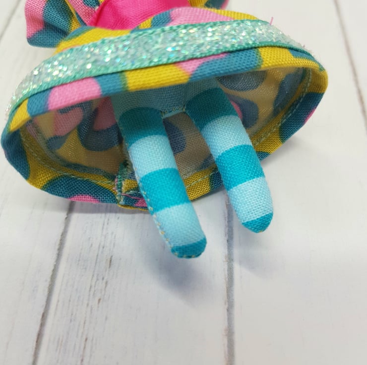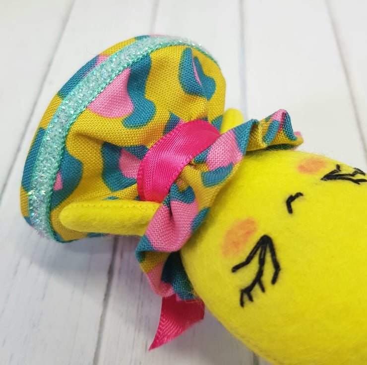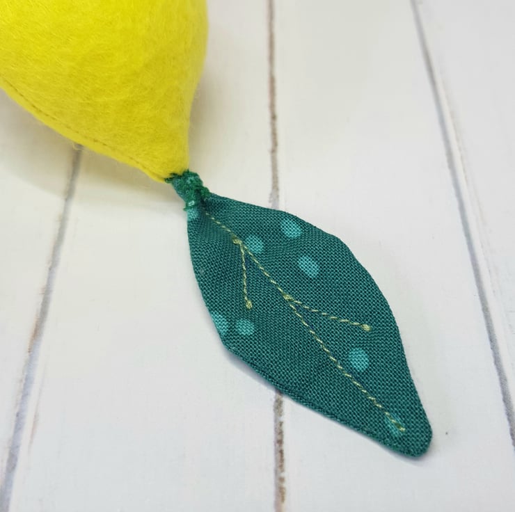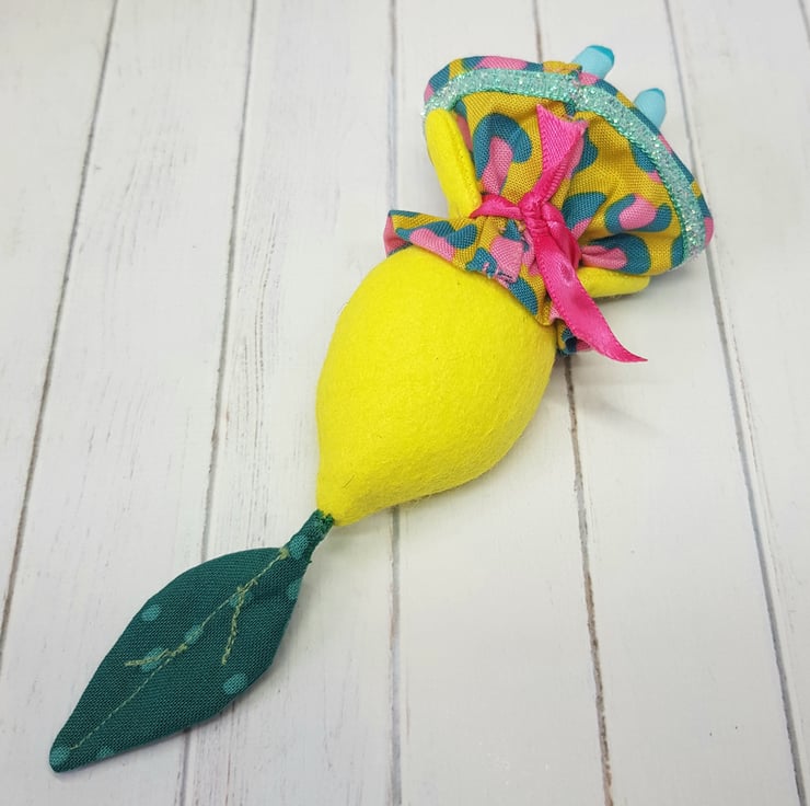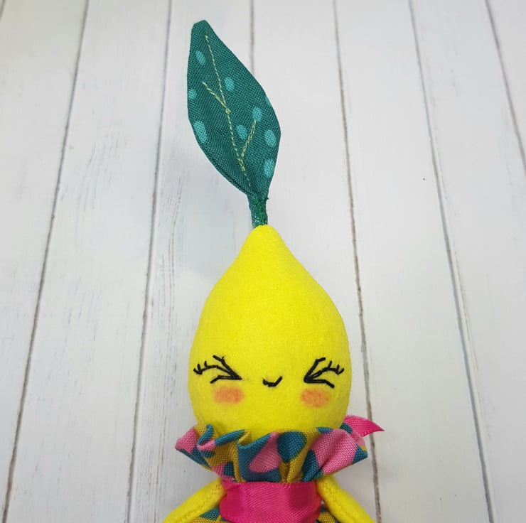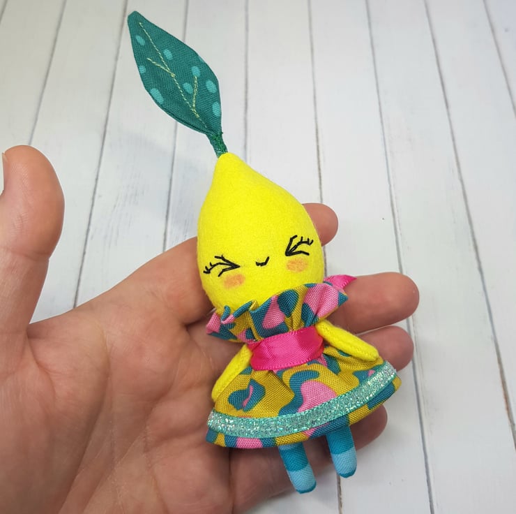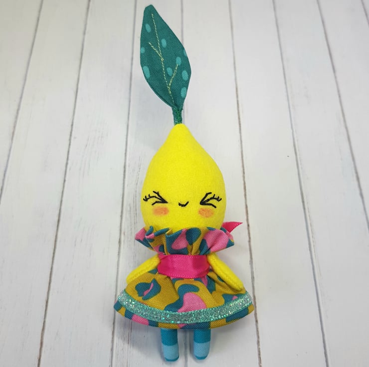 Miniature fruit art doll made from felt with hand embroidered face and rosy waxed cheeks. This lemon wears a dress with sparkly trim and spotty cotton legs. The lemon has a free motion embroidered leaf atop her head and measures roughly 16cm tall. Comes with optional transparent loop hanger.