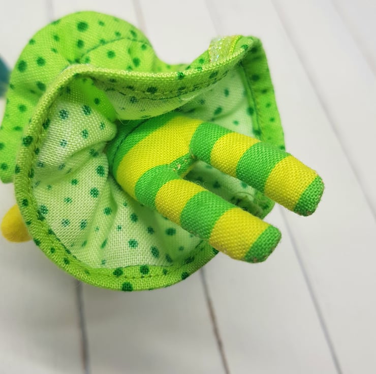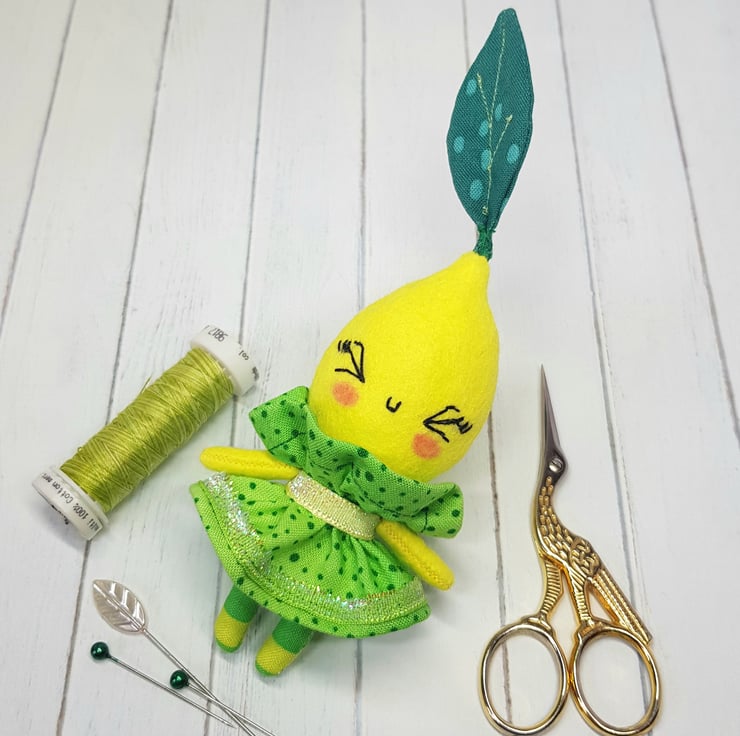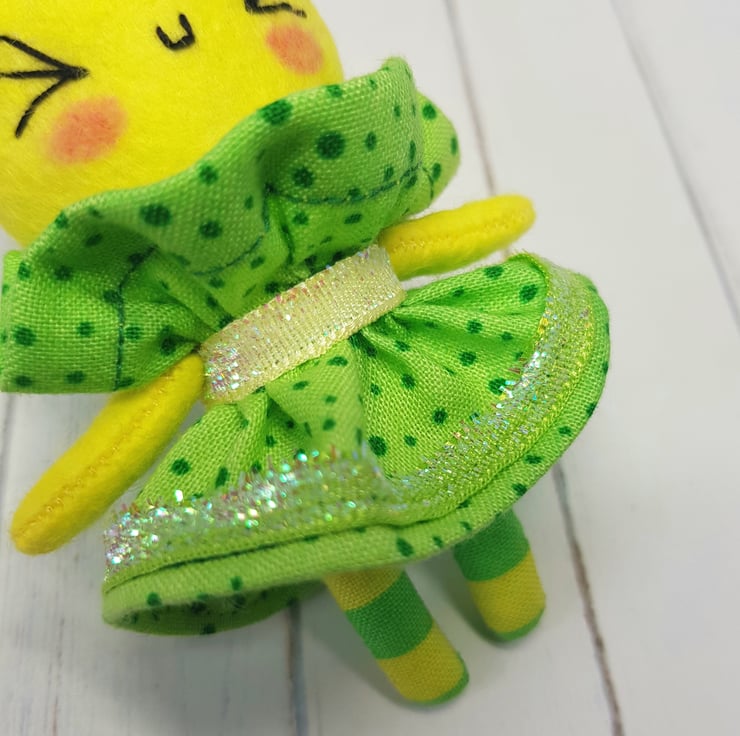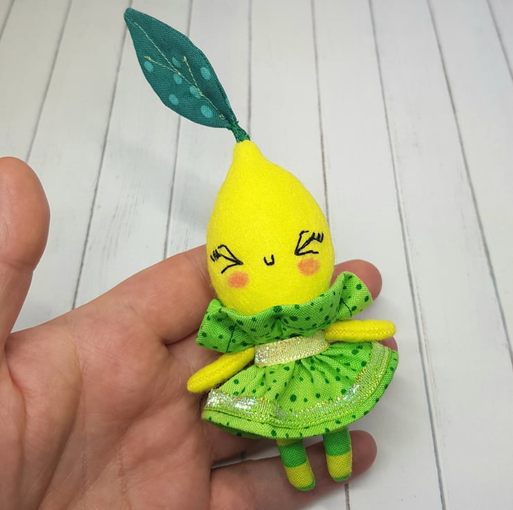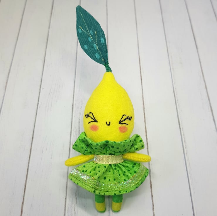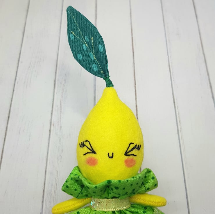 Miniature fruit art doll made from felt with hand embroidered face and rosy waxed cheeks. This lemon wears a dress with sparkly trim and spotty cotton legs. The lemon has a free motion embroidered leaf atop her head and measures roughly 16cm tall. Comes with optional transparent loop hanger.