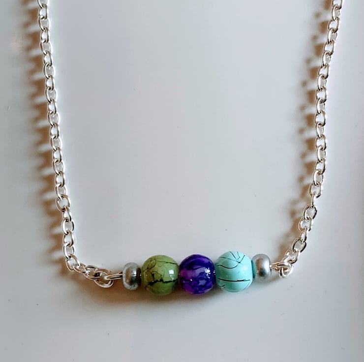 Green purple and duck egg blue marble glass beads that reflect beautifully in the light on a silver plated cable chain.