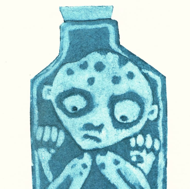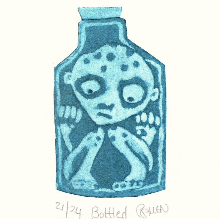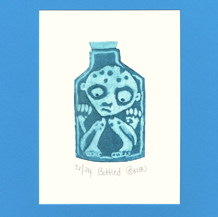 This cute little fellow has got himself stuck in a bottle. This a a small but sweet collagraph print. It is 10cm x 14cm and is printed on watercolour paper, with blue ink. It's a small print run of 24 and this is number 21. I printed some of the 24 in black, so please let me know if you wish to see a black print. It will come cellophane wrapped, so will make a nice gift.