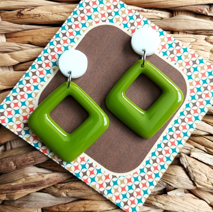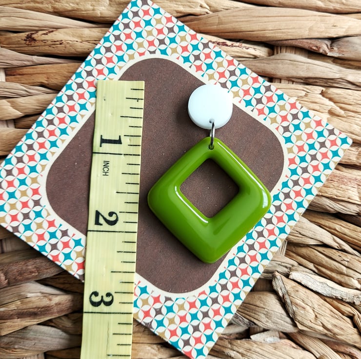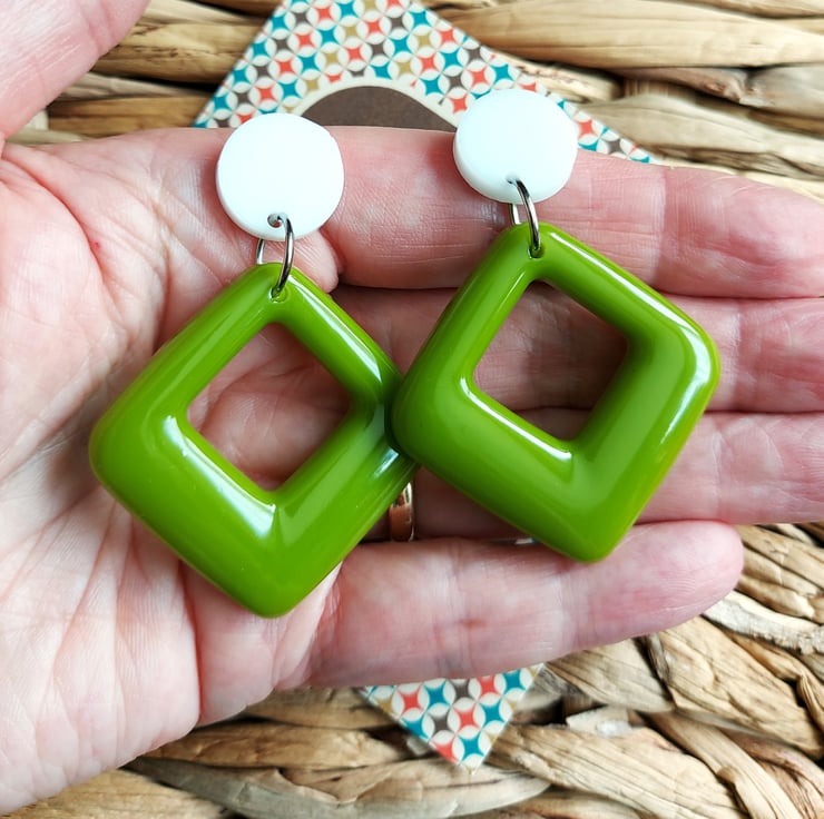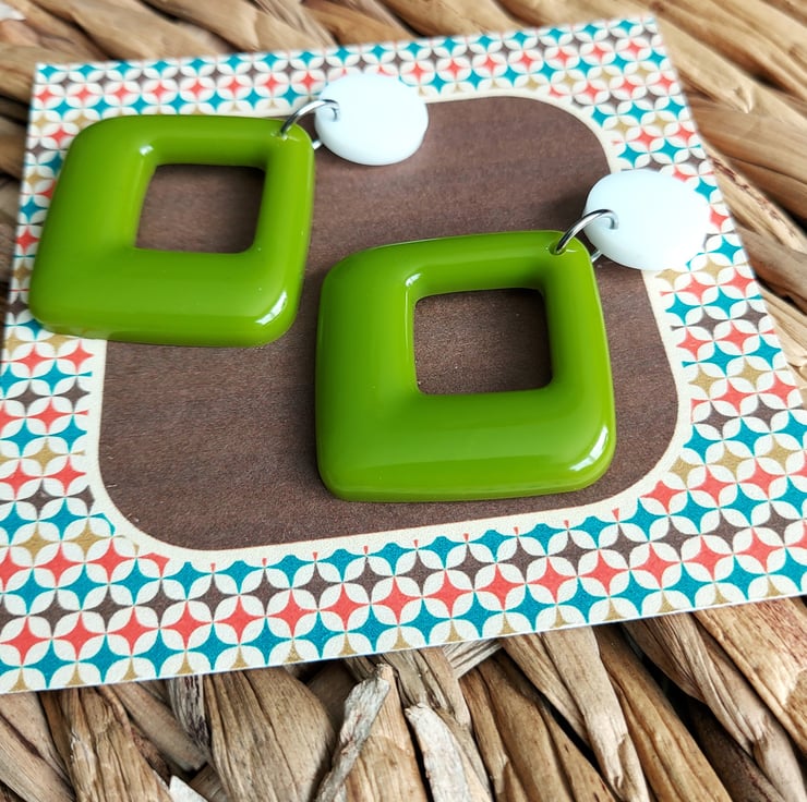 These gorgeous 1960's inspired earrings have been made from resin, the diamond shaped drop is finished in a apple green colouring. The 15mm flat top is made in white resin and