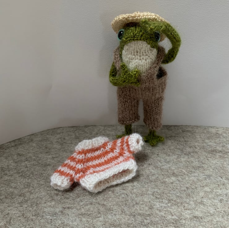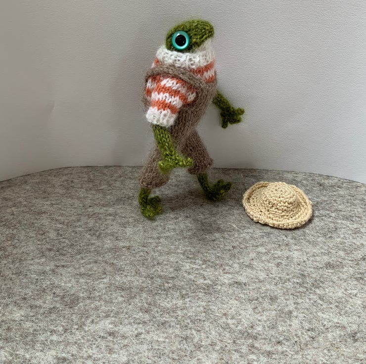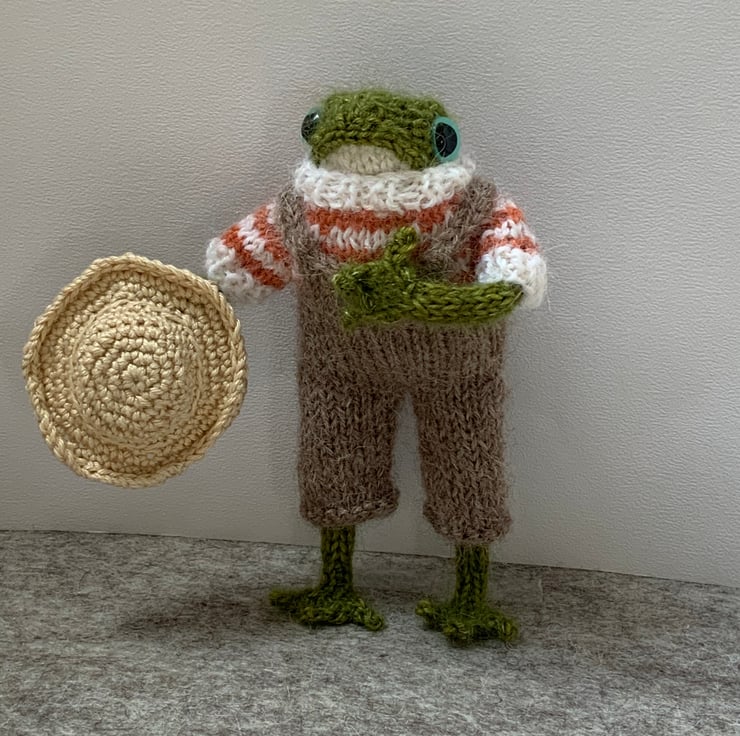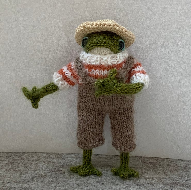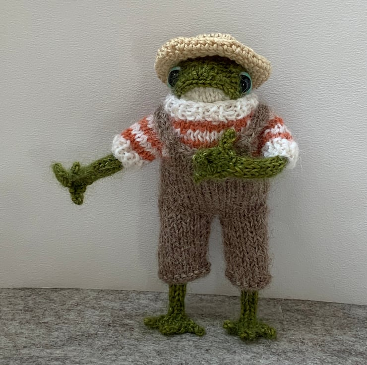 His body measures approximately 8cm and his hind legs when extended add an additional 8cm. I have endeavoured to conceal the wires, however, from time to time one might work through to the surface. Gently reposition the yarn over the wire to hide again. The wires are finished at the wrist in the forelegs but extend into the lower part of the foot so he can stand, albeit with a bit of balancing !