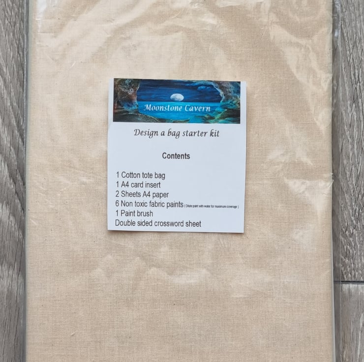 Cotton tote bag with fabric paints, comes with 2 A4 plain sheets of paper to draw your design. Simply sketch a small design on the paper, then carefully copy the design on to your bag. If you have stencils or stamps you can incorporate these all into your design. Included is 6 small pots of non toxic fabric paint and paint brush. Please dilute with a little water as this will make the paints go further and apply better to the fabric. Keep the card separator inside the bag to stop any paint bleeding through to the back of the bag, remove after paint is dry. These kits are designed with adults or older children in mind.