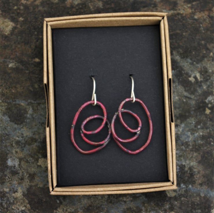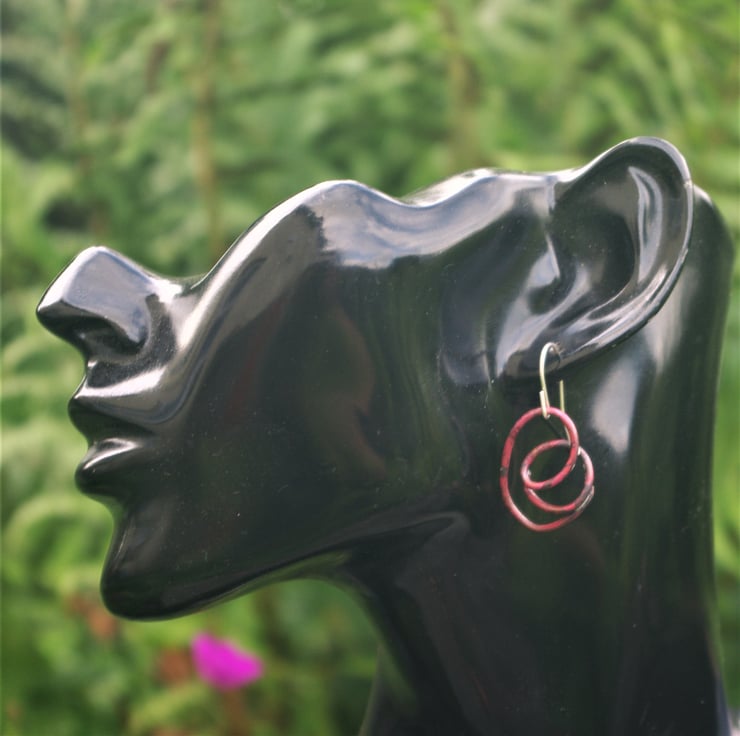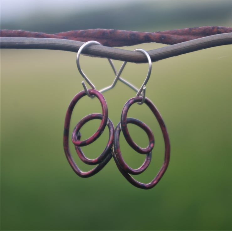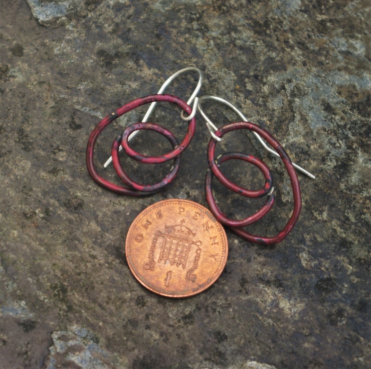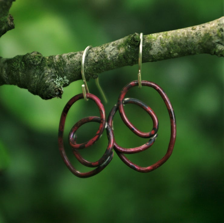 I have soldered a copper swirl of wire , onto a sterling silver hook . The total length is 35mm/ just under 1.5 inches inch from the top of the hook. The copper has become a deep, interesting shade of dark red through a heat process. The colour is preserved with a penetrating wax.