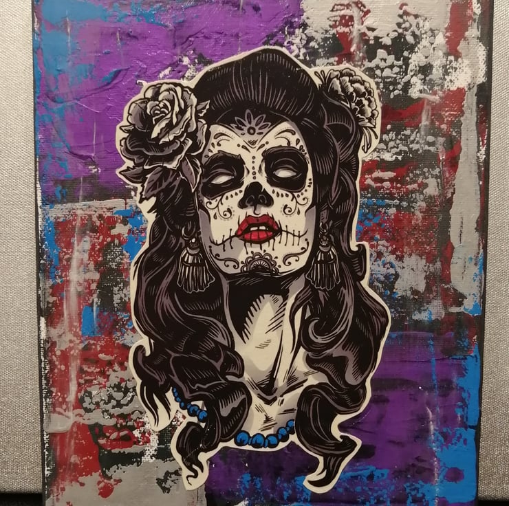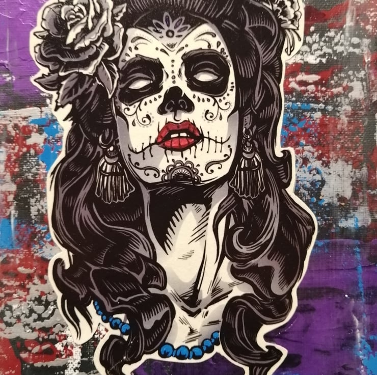 Painted with Acrylic Paints and finished off with La Catrina embellishment. Coat of gloss for protection.