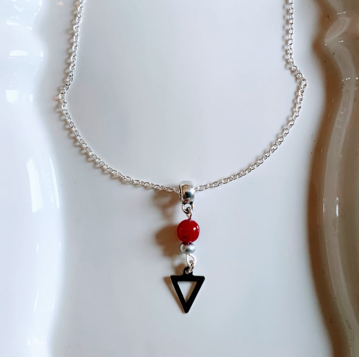 Featuring bright red marble glass bead and silver mini rochelle. Hanging from a small shiny silver bail. On a 18 inch delicate 925 silver engraving chain with lobster clasp.