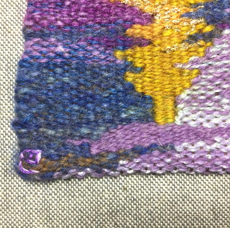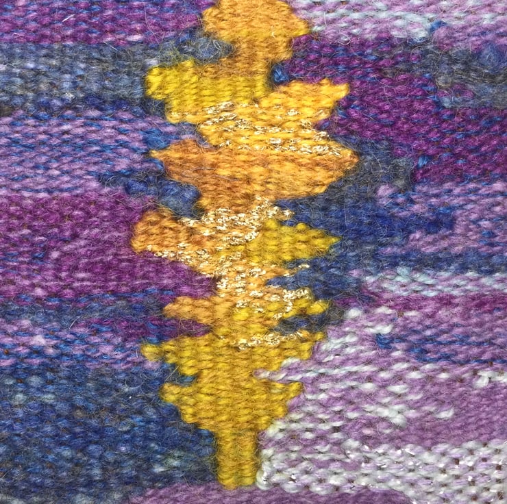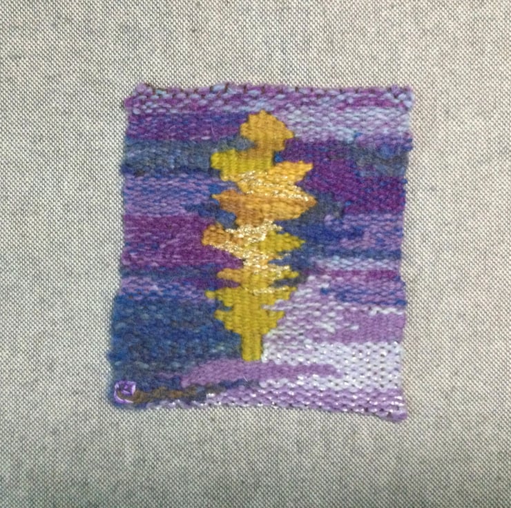 Oak Leaf is a small handwoven tapestry made with a mixture of wools, and yarn with metallic threads. It has been woven with a brown cotton warp, and the weft is varied in its shades with its mix of wools in shades of ochre, yellow, gold, purple and blue. The darker blue is one of my hand spun merino yarns. It has been stitched onto linen mix fabric measuring approx 18 x 18cm with the weaving itself measuring 9 x 10cm, and is ready for framing.