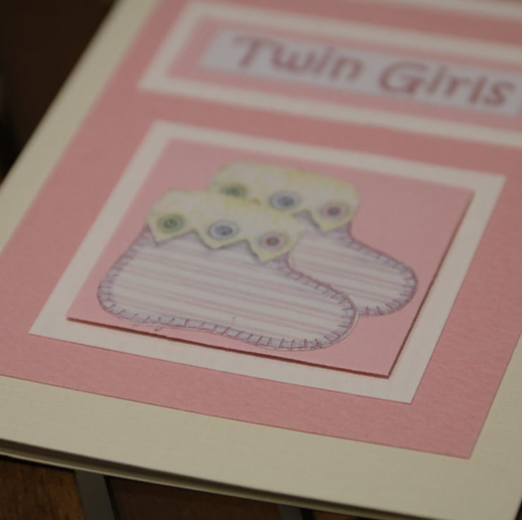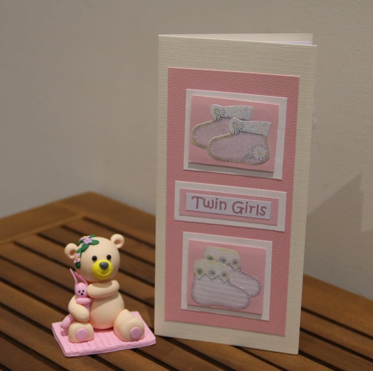 New Baby - Twin Girls card, Baby bootees, DL card & envelope