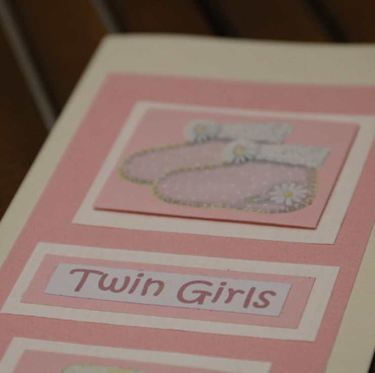Two pairs of pink bootees, mounted onto pink card squares, then mounted onto textured ivory coloured card squares to give a slight 3d effect. background. The bootees were handcut from some scraps of gift paper I had in my stash, one pair decorated with daisies, the other stripey. 'Twin Girls' in the centre of the card printed in pink, uses the same pink card with ivory card, in reverse order. These components have then been mounted onto a piece of pink hammer textured card