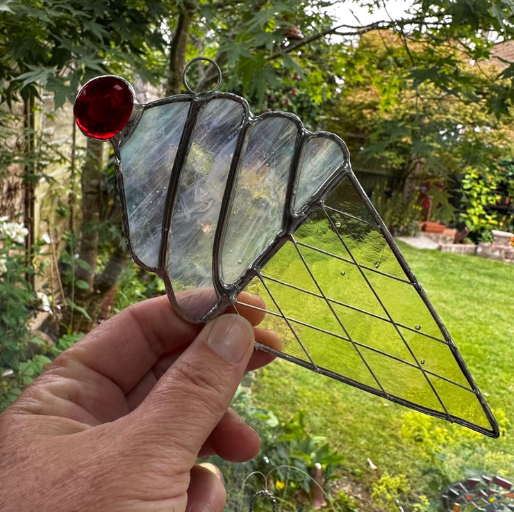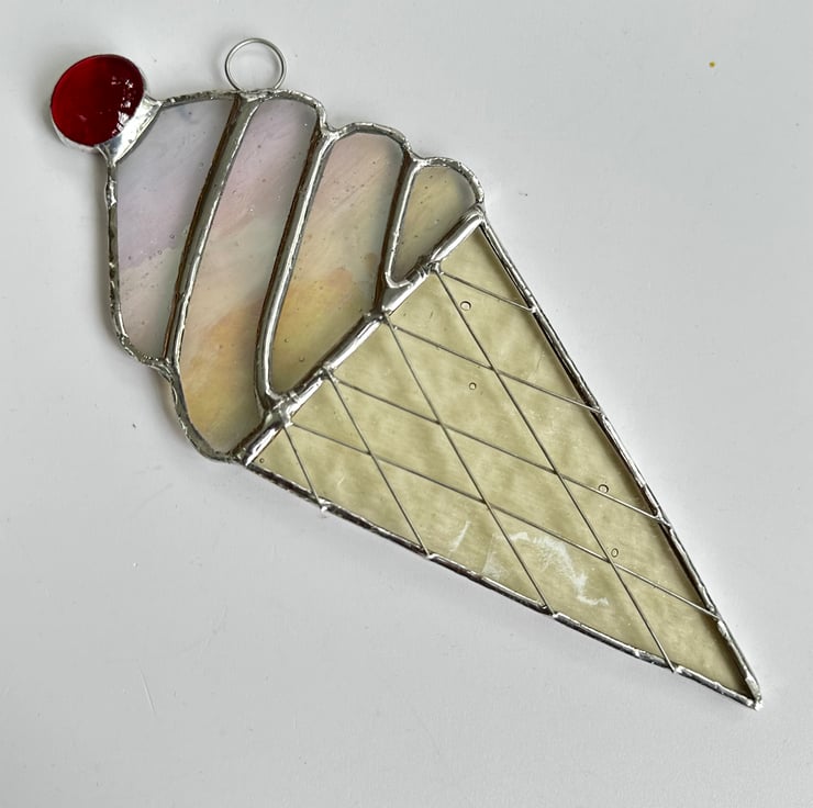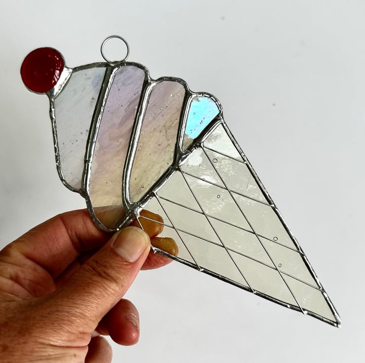 The glass used is white streaky white irredised glass (this has a shimmer like a petrol stain) and pale amber textured glass for the cone. A red glass nugget has been used for the cherry.