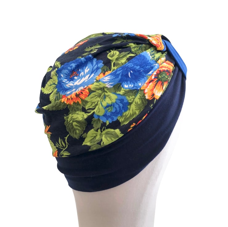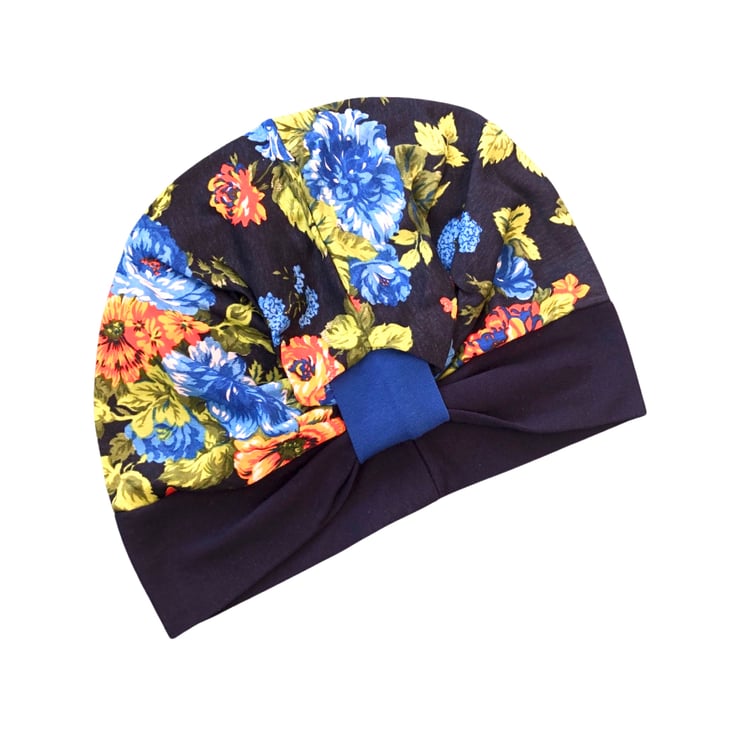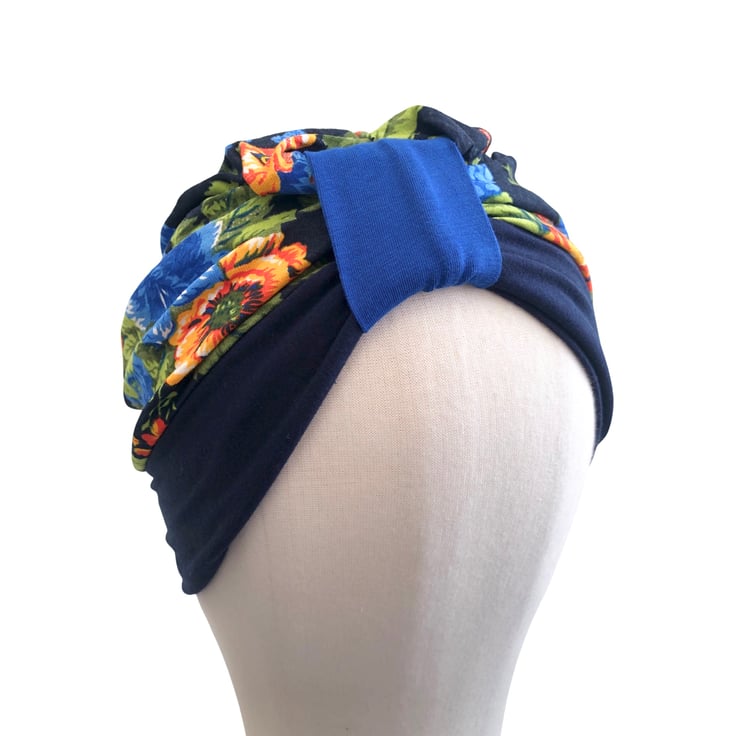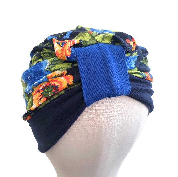 This is a stretchy single-layer (not lined) design cotton jersey turban hat, created from different colour pieces of fabric. Bright and fun!