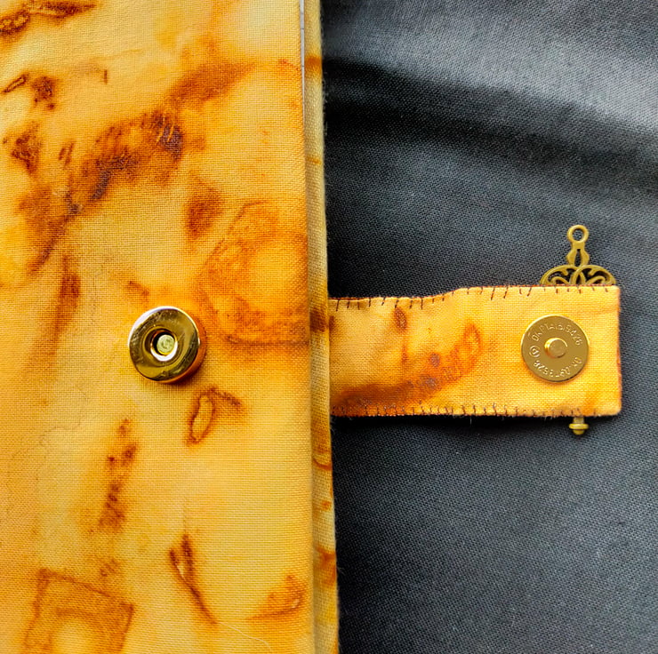 This dyeing process works best on natural fibres, I always use cotton fabric that has been washed to remove any dressing and no fabric conditioner. Once dry and ironed it is sprayed with a solution of 50/50 water and white vinegar before arranging any rusty metal objects, folding and layering more metal objects and giving the whole thing another good spray so that all the surfaces are wet and in contact with the solution.