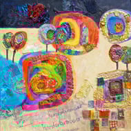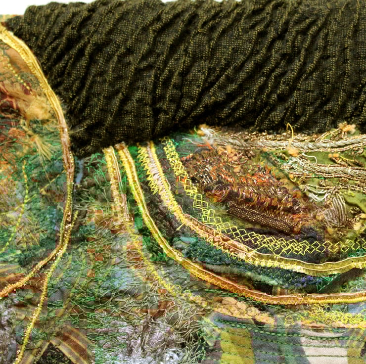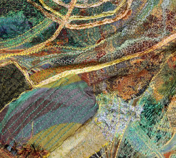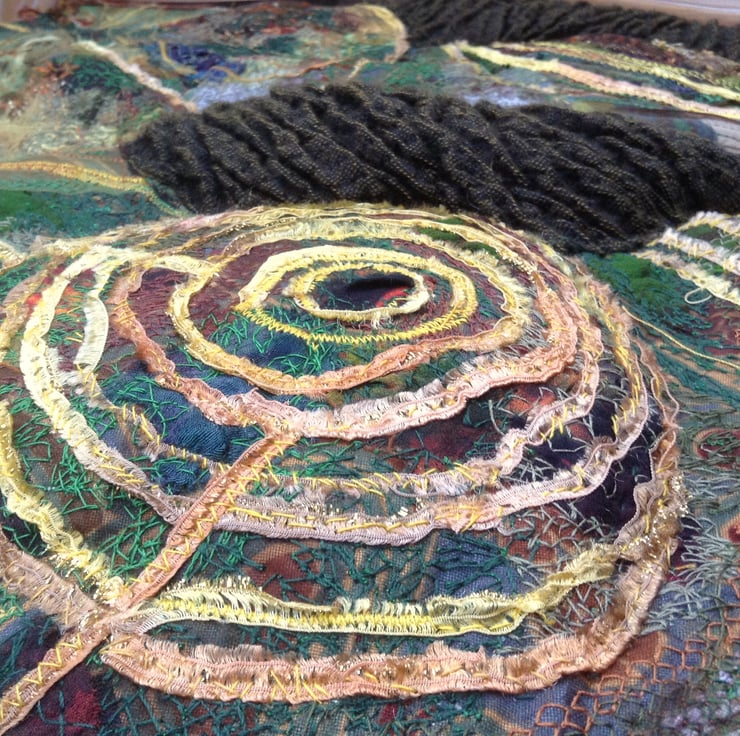 This wall hanging incorporates free motion embroidery, hand stitching, appliqué and quilting. It is made on a base of Liberty Ianthe fabric onto which I have stitched patches of dyed silk, various cottons, lace, organza and other upcycled fabrics. I have also machine stitched into these fabrics, using both free machine stitch and set pattern stitches, to give an interesting and varied texture to the surface. I have used concentric circles of gold hand- dyed silk ribbon which I have stitched by hand. I have added padding of bubble wrap and plastic bags to areas of the whole piece,to create 3D relief, and backed it onto a piece of furnishing fabric to give it a good firm but flexible structure. There is doweling at the top and bottom so it keeps its shape when hung on the wall.