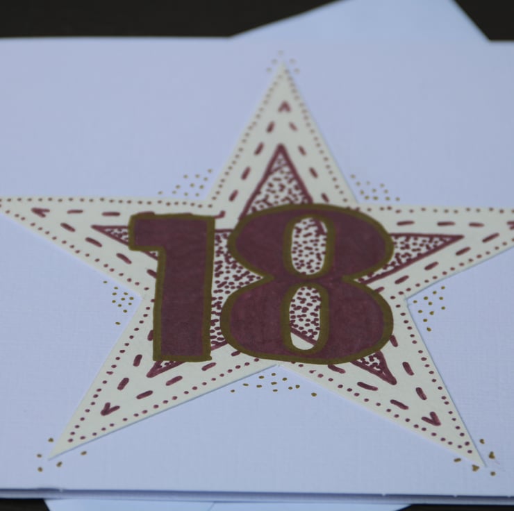 A handrawn star with 18 in the centre of the star. The star has been drawn on watercolour paper in mettalic pink pen, with 18 in pink with gold outline. The background behind the number is filled in using a Pointillism technique in the same colour as the lines of the star.