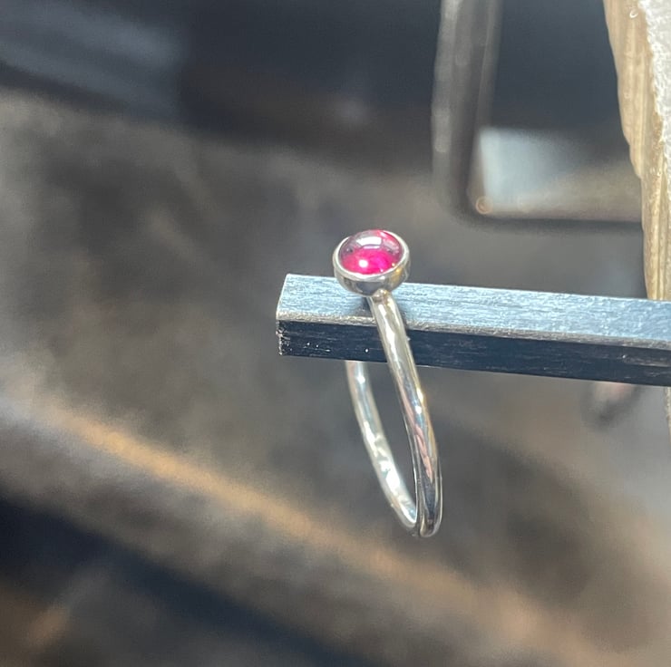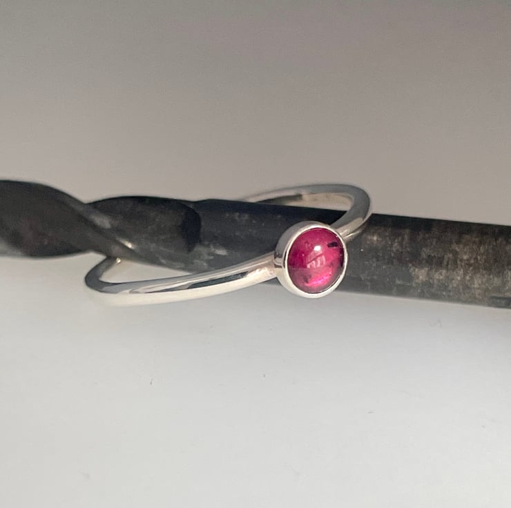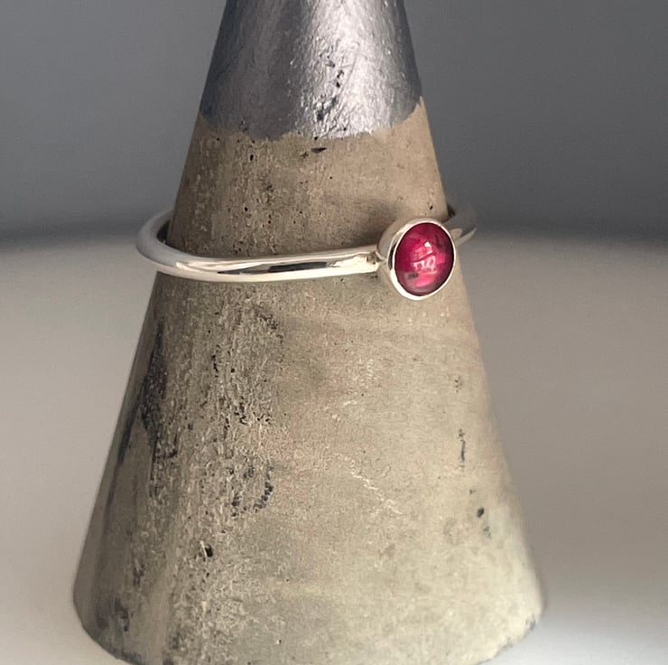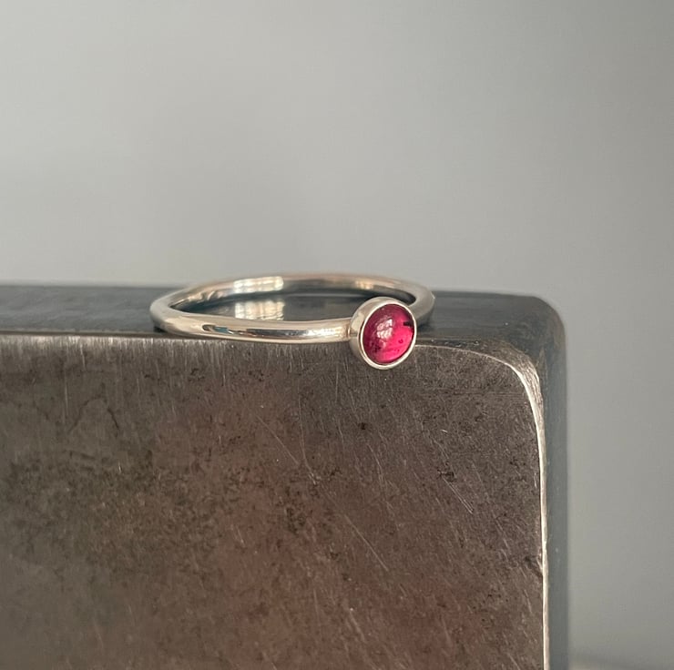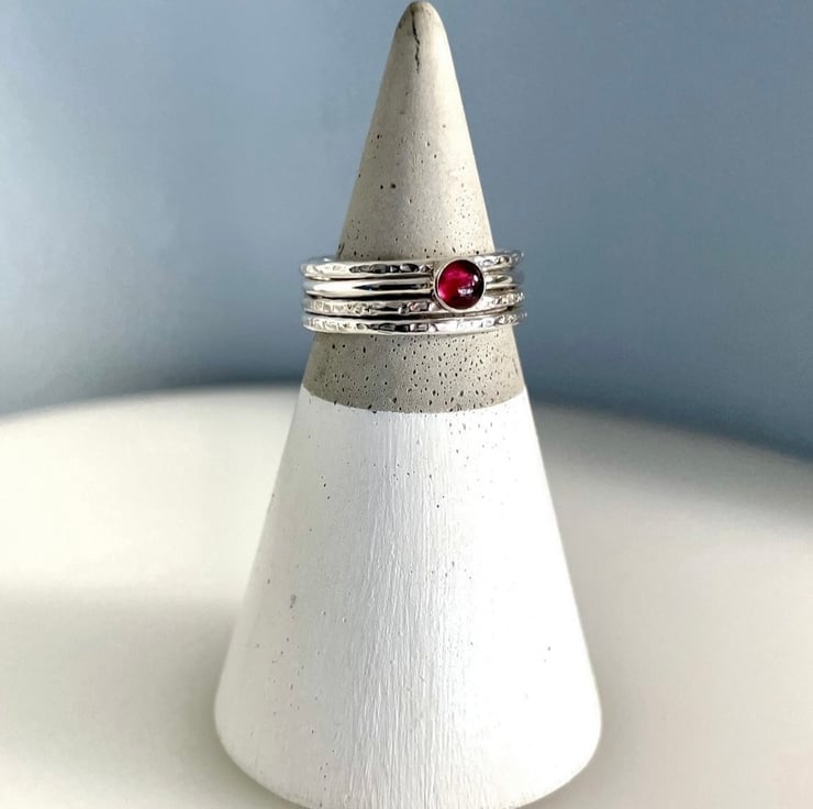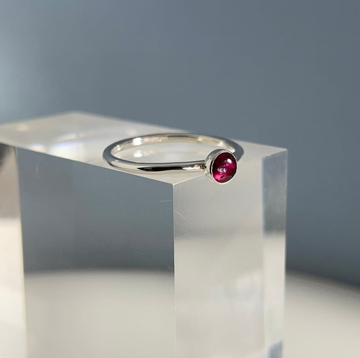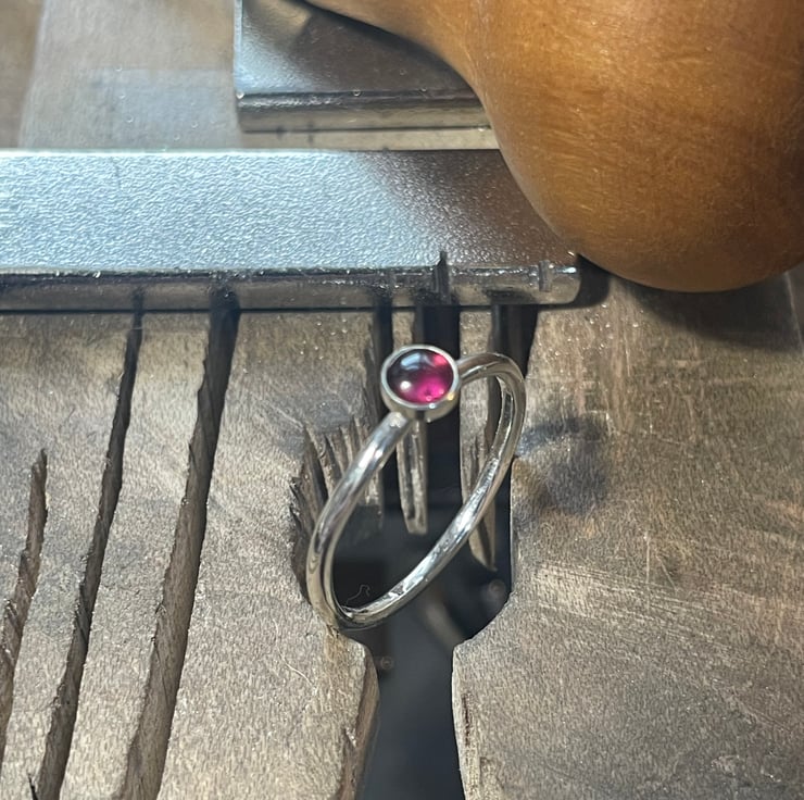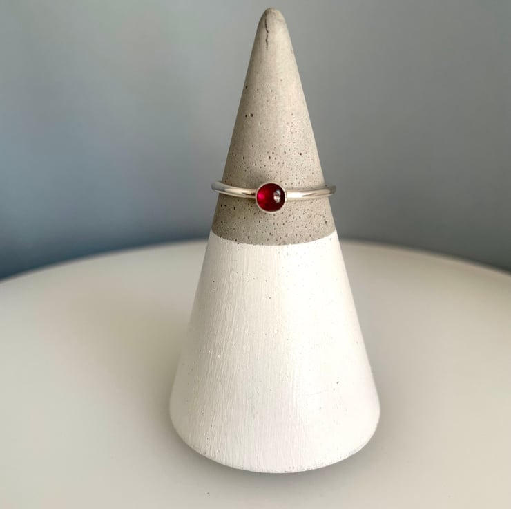 A lovely slim, dainty, but sturdy plain-smooth stacking ring handmade from solid 1.5mm thick 925 sterling silver round wire and set with deep red 4mm Garnet gemstone.
