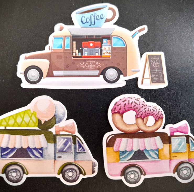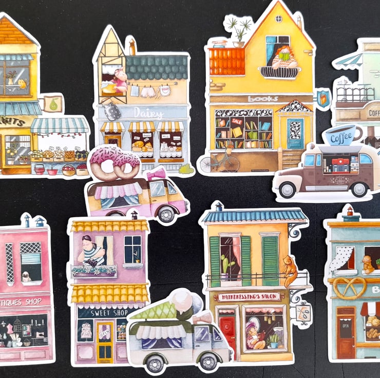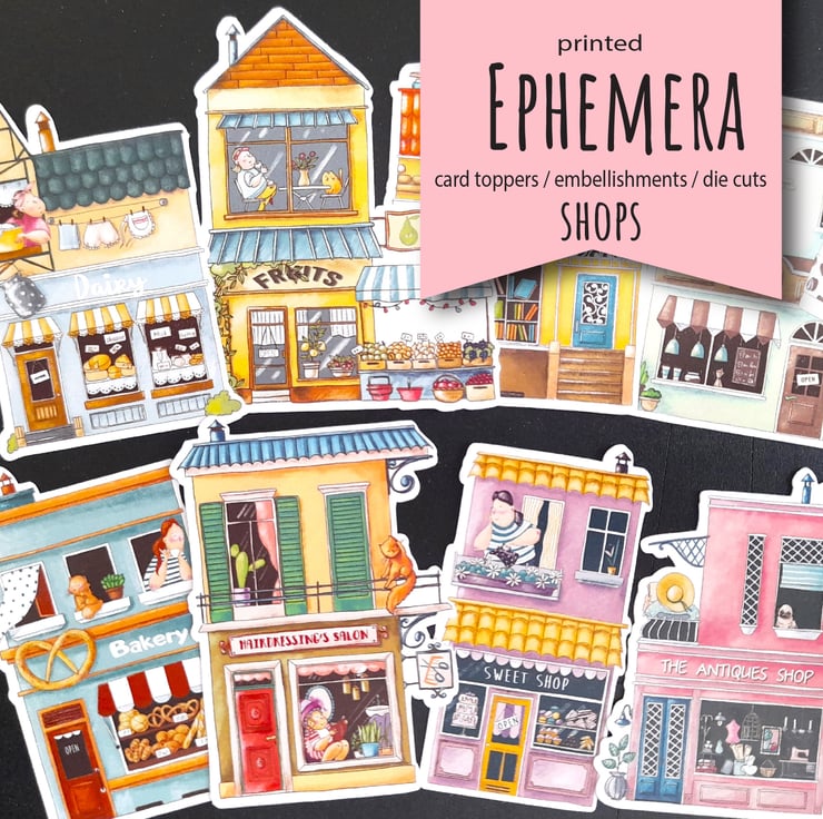 One pack of handmade, digitally cut ephemera / embellishments with a cute shop and delivery theme, watercolour style, printed onto 250gsm silk cardstock. Wonderful for card making, scrap booking, journaling, etc. Pack includes 8 different shops and 3 delivery trucks.