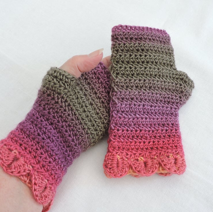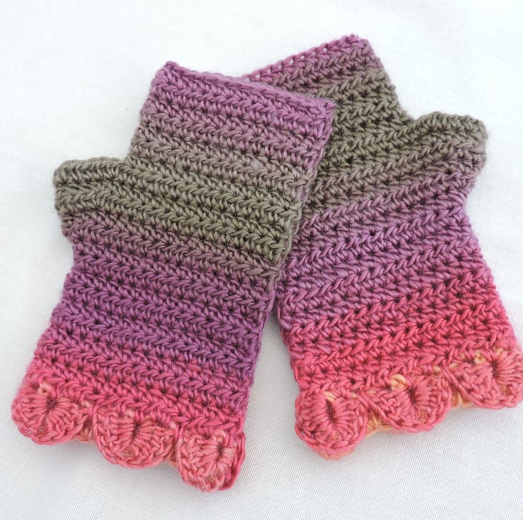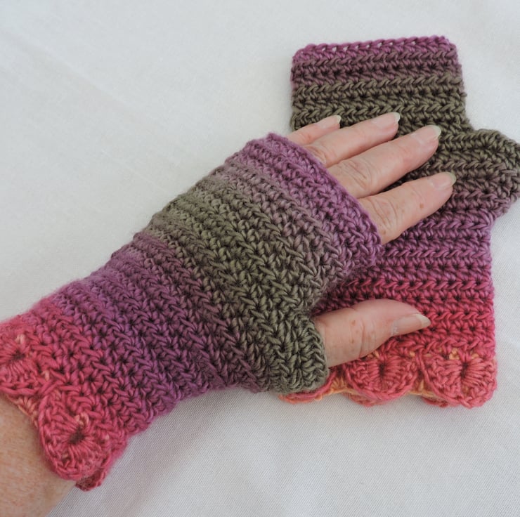 Adults dragon scale cuff crochet fingerless mitts made using a double knit self striping acrylic yarn. Pretty graduated colours of mauve, olive and pink. These mitts have a single row of dragon scales at the cuffs and a plain body. Warm and cosy, ideal for the cold weather. Ideal for those who need to have their fingers free.