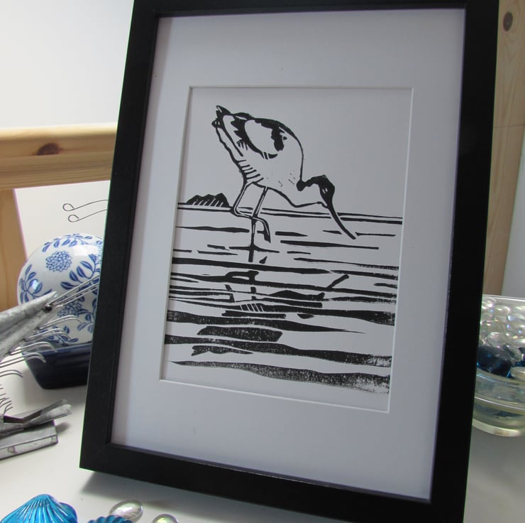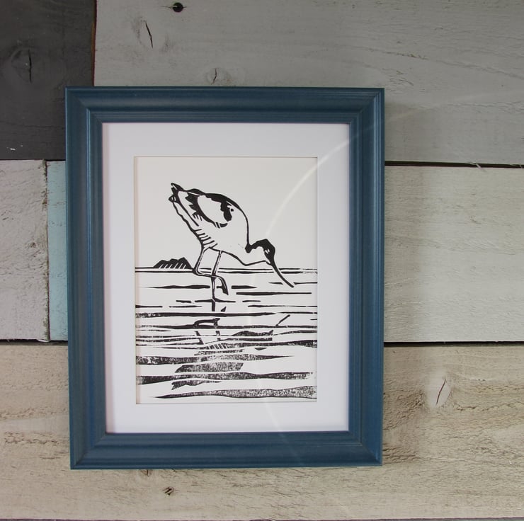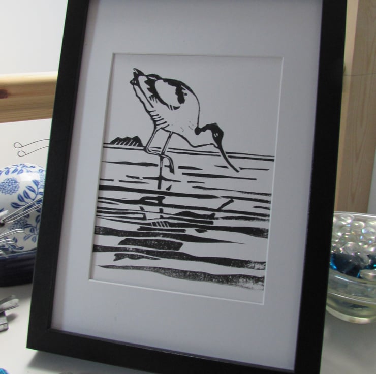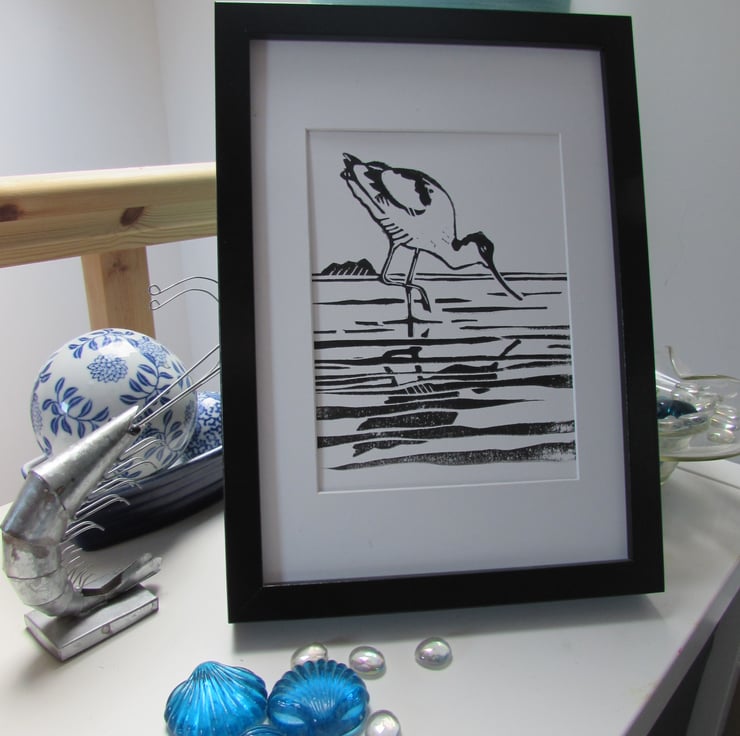 An original hand made linoprint. A nautical beach scene featuring an Avocet, a beautiful wading bird that is a regular visitor to our shores. The handmade process results in small changes to each print so every print is original and unique. The inspiration for all my work listed is from travel, nature and the natural world. Printed on 200 gsm, acid free, printing cartridge paper using high quality printing inks. This is an artwork print, not a copy and is unmounted and unframed. Designed to easily fit an A5 image size mount ( 148 x 210 mm) and frame as shown. Also suitable for a 6"x 8" aperture mount in a standard 8" x 10" frame. Dispatched in a hard back package with free UK delivery.