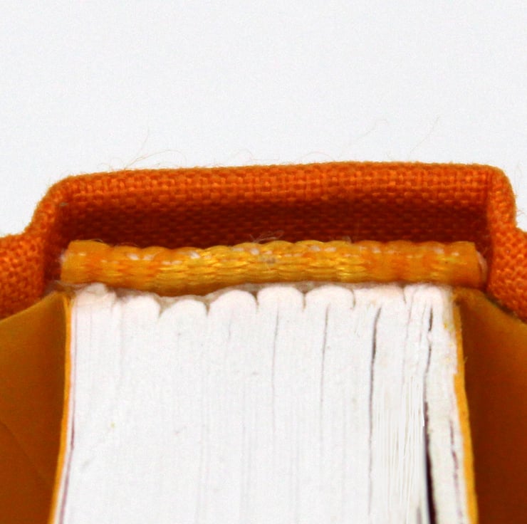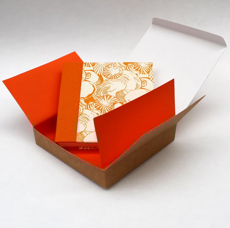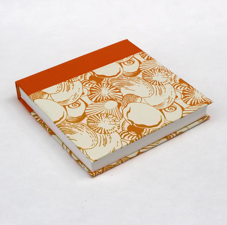 The covers are in a hand printed patterned paper in orange on cream of a shell design.The spine is covered in orange book cloth for long life.