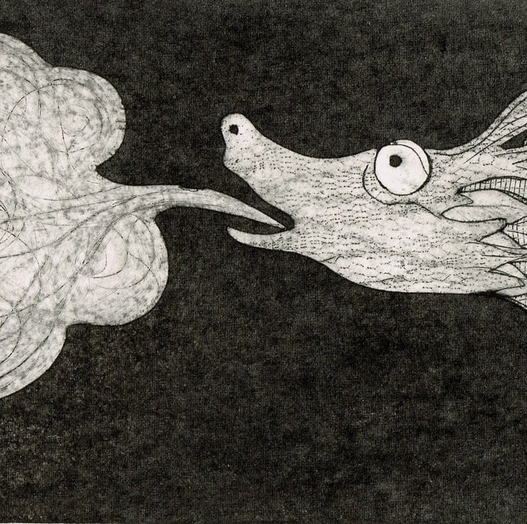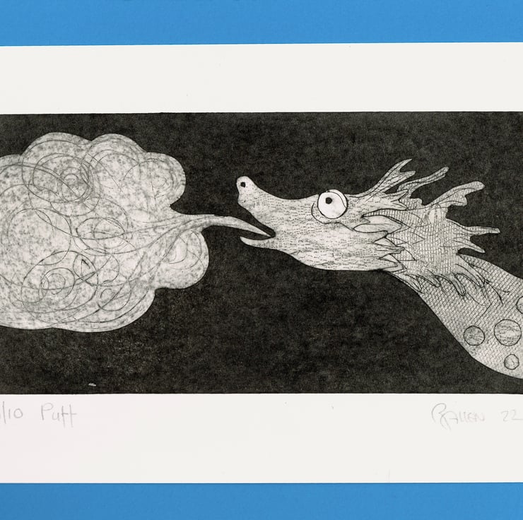 This is Puff, the Magic dragon. He is a collagraph print made with lots textured bits and fancy stuff. The print is a limited edition, I only print 10 and this is 9 /10. The print is 28cm x 17cm and the etched area is 21cm x 11cm.